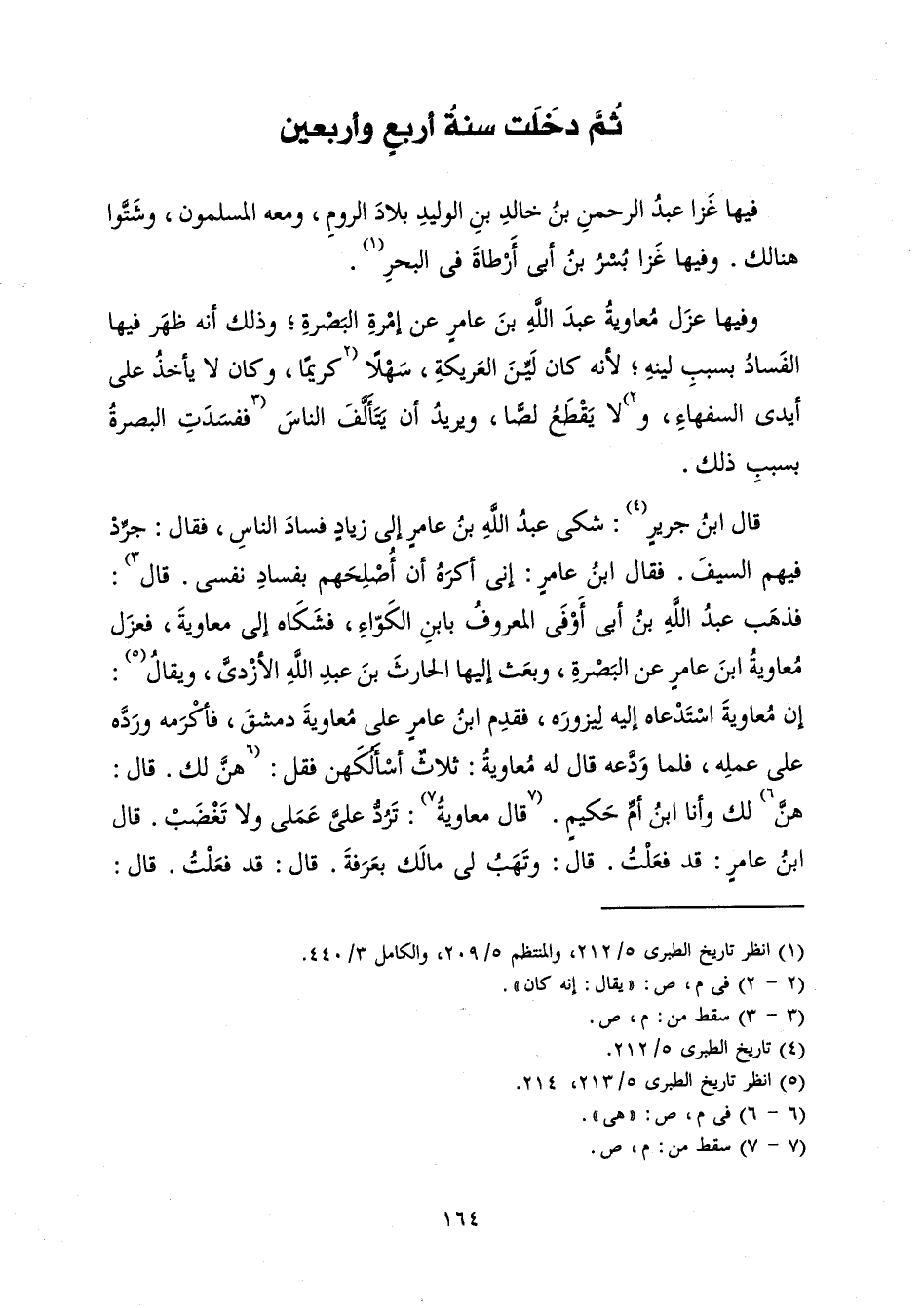 وَفِيهَا عَزَلَ مُعَاوِيَةُ عَبْدَ اللَّهِ بْنَ عَامِرٍ عَنْ إِمْرَةِ الْبَصْرَةِ ; وَذَلِكَ أَنَّهُ ظَهَرَ فِيهَا الْفَسَادُ بِسَبَبِ لَيِنَهِ ; لِأَنَّهُ كَانَ لَيِّنَ الْعَرِيكَةِ، سَهْلًا كَرِيمًا، وَكَانَ لَا يَأْخُذُ عَلَى أَيْدَى السُّفَهَاءِ، وَلَا يَقْطَعُ لِصًّا، وَيُرِيدُ أَنْ يَتَأَلَّفَ النَّاسُ فَفَسَدَتِ الْبَصْرَةُ بِسَبَبِ ذَلِكَ.