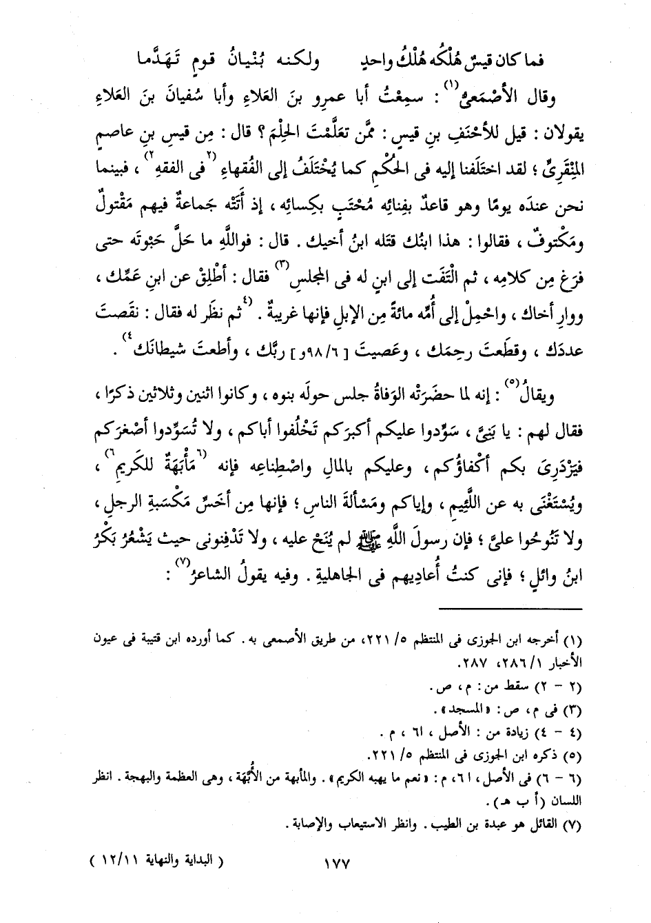 وَقَالَ الْأَصْمَعِيُّ: سَمِعْتُ أَبَا عَمْرِو بْنَ الْعَلَاءِ وَأَبَا سُفْيَانَ بْنَ الْعَلَاءِ يَقُولَانِ: قِيلَ لِلْأَحْنَفِ بْنِ قَيْسٍ: مِمَّنْ تَعَلَّمْتِ الْحِلْمَ؟ قَالَ: مِنْ قَيْسِ بْنِ عَاصِمٍ الْمِنْقَرِيِّ ; لَقَدِ اخْتَلَفْنَا إِلَيْهِ فِي الْحُكْمِ كَمَا يُخْتَلَفُ إِلَى الْفُقَهَاءِ فِي الْفِقْهِ، فَبَيْنَمَا نَحْنُ عِنْدَهُ يَوْمًا وَهُوَ قَاعِدٌ بِفِنَائِهِ مُحْتَبٍ بِكِسَائِهِ، إِذْ أَتَتْهُ جَمَاعَةٌ فِيهِمْ مَقْتُولٌ وَمَكْتُوفٌ، فَقَالُوا: هَذَا ابْنُكَ قَتَلَهُ ابْنُ أَخِيكَ. قَالَ: فَوَاللَّهِ مَا حَلَّ حَبَوْتَهُ حَتَّى فَرَغَ مِنْ كَلَامِهِ، ثُمَّ الْتَفَتْ إِلَى ابْنٍ لَهُ فِي الْمَجْلِسِ فَقَالَ: أَطْلِقْ عَنِ ابْنِ عَمِّكَ، وَوَارِ أَخَاكَ، وَاحْمِلْ إِلَى أُمِّهِ مِائَةً مِنَ الْإِبِلِ فَإِنَّهَا غَرِيبَةٌ. ثُمَّ نَظَرَ لَهُ فَقَالَ: نَقَصْتَ عَدَدَكَ، وَقَطَعْتَ رَحِمَكَ، وَعَصَيْتَ رَبَّكَ، وَأَطَعْتَ شَيْطَانَكَ.