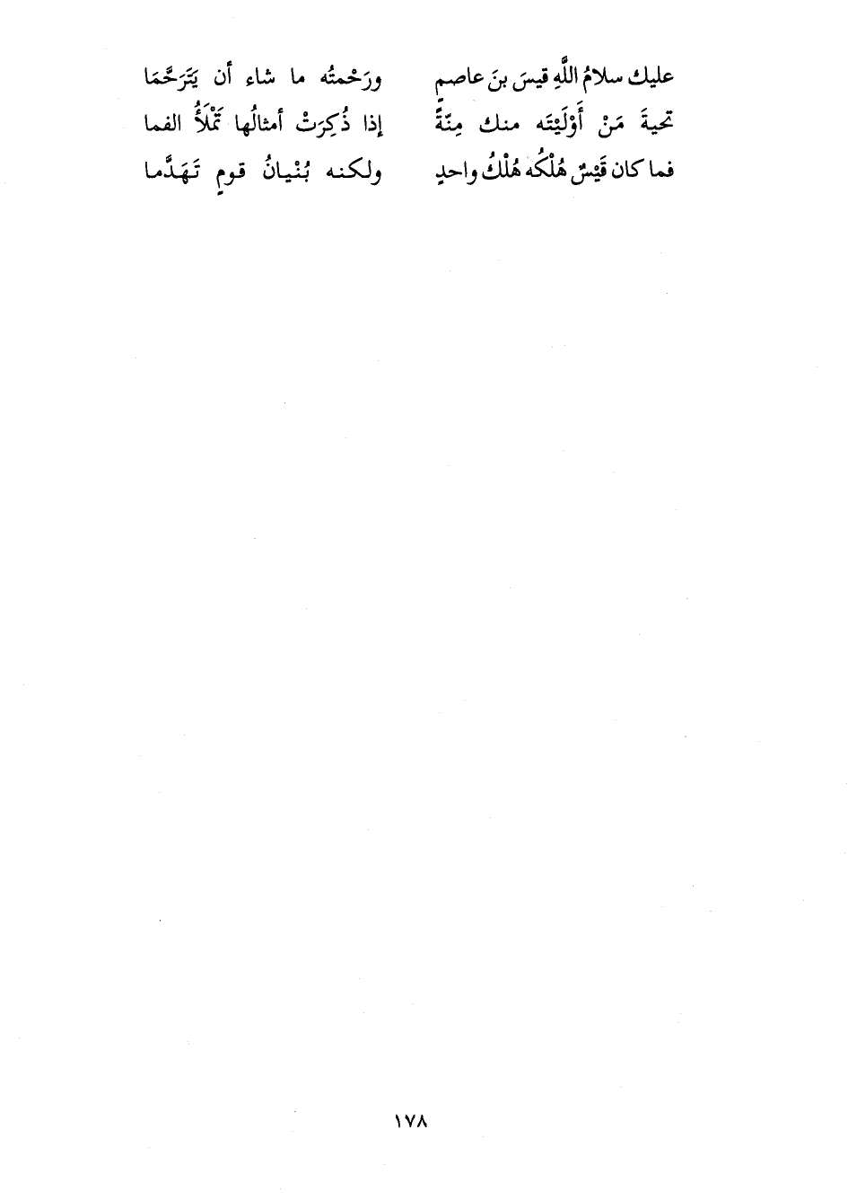 عَلَيْكَ سَلَامُ اللَّهِ قَيْسُ بْنَ عَاصِمٍ ... وَرَحْمَتُهُ مَا شَاءَ أَنْ يَتَرَحَّمَا