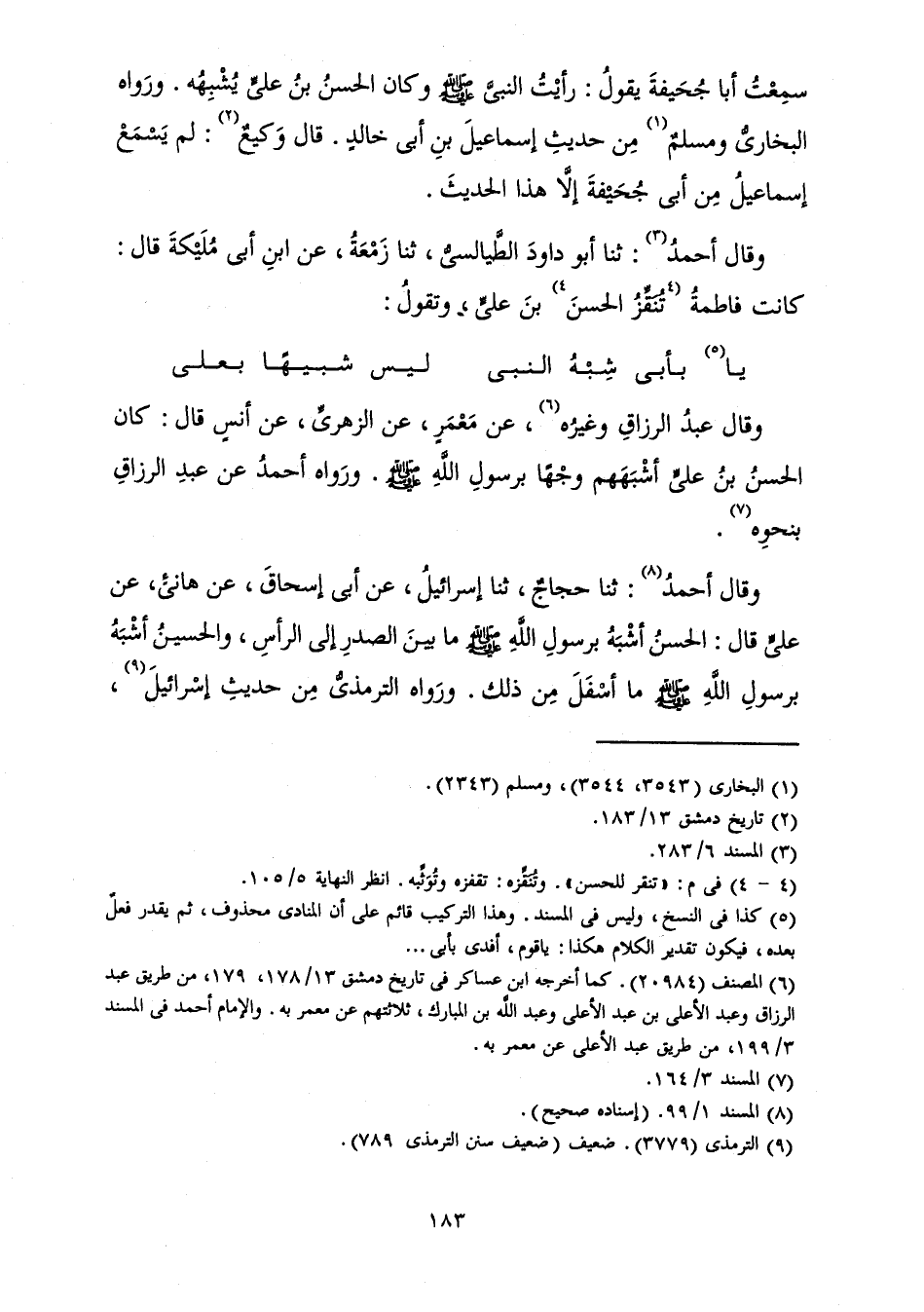 سَمِعْتُ أَبَا جُحَيْفَةَ يَقُولُ: «رَأَيْتُ النَّبِيَّ صَلَّى اللَّهُ عَلَيْهِ وَسَلَّمَ وَكَانَ الْحَسَنُ بْنُ عَلِيٍّ يُشْبِهُهُ.» وَرَوَاهُ الْبُخَارِيُّ وَمُسْلِمٌ مِنْ حَدِيثِ إِسْمَاعِيلَ بْنِ أَبِي خَالِدٍ. قَالَ وَكِيعٌ: لَمْ يَسْمَعْ إِسْمَاعِيلُ مِنْ أَبِي جُحَيْفَةَ إِلَّا هَذَا الْحَدِيثَ.