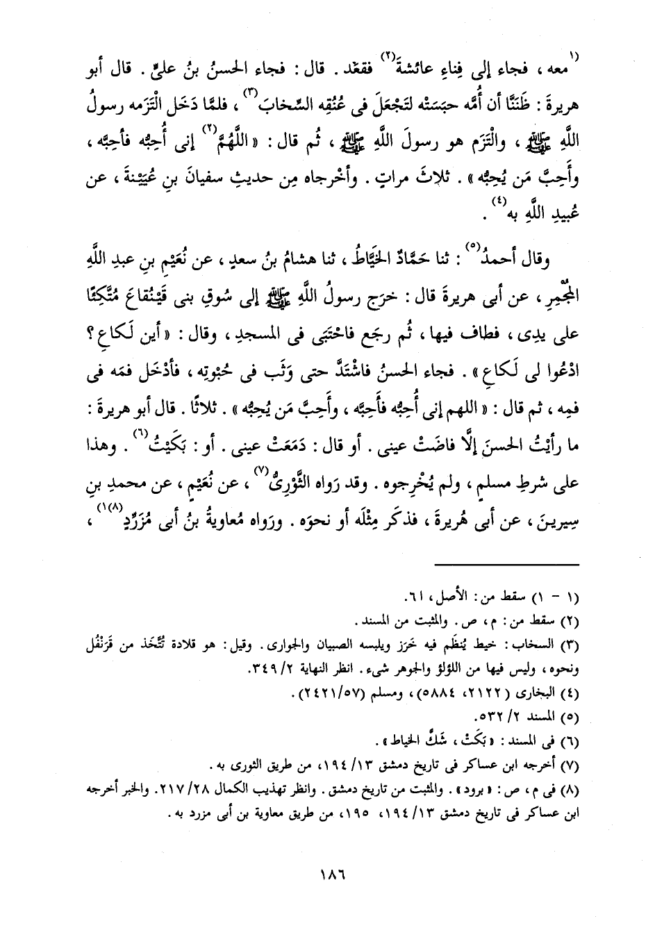 وَقَالَ أَحْمَدُ: ثَنَا حَمَّادٌ الْخَيَّاطُ، ثَنَا هِشَامُ بْنُ سَعْدٍ، عَنْ نُعَيمِ بْنِ عَبْدِ اللَّهِ الْمُجْمِرِ، عَنْ أَبِي هُرَيْرَةَ قَالَ: «خَرَجَ رَسُولُ اللَّهِ صَلَّى اللَّهُ عَلَيْهِ وَسَلَّمَ إِلَى سُوقِ بَنِي قَيْنُقَاعَ مُتَّكِئًا عَلَى يَدِي، فَطَافَ فِيهَا، ثُمَّ رَجَعَ فَاحْتَبَى فِي الْمَسْجِدِ، وَقَالَ: " أَيْنَ لُكَاعُ؟ ادْعُوَا لِي لُكَاعُ ". فَجَاءَ الْحَسَنُ فَاشْتَدَّ حَتَّى وَثَبَ فِي حَبْوَتِهِ، فَأَدْخَلَ فَمَهُ فِي فَمِهِ، ثُمَّ قَالَ: " اللَّهُمَّ إِنِّي أُحِبُّهُ فَأَحِبَّهُ، وَأَحِبَّ مَنْ يُحِبُّهُ " ثَلَاثًا. قَالَ أَبُو هُرَيْرَةَ: مَا رَأَيْتُ الْحَسَنَ إِلَّا فَاضَتْ عَيْنِي. أَوْ قَالَ: دَمَعِتْ عَيْنِي. أَوْ: بَكَيْتُ» . وَهَذَا عَلَى شَرْطِ مُسْلِمٍ، وَلَمْ يُخْرِجُوهُ، وَقَدْ رَوَاهُ الثَّوْرِيُّ، عَنْ نُعَيمٍ، عَنْ مُحَمَّدِ بْنِ سِيرِينَ، عَنْ أَبِي هُرَيْرَةَ، فَذَكَرَ مِثْلَهُ أَوْ نَحْوَهُ. وَرَوَاهُ مُعَاوِيَةُ بْنُ أَبِي مُزَرِّدٍ،