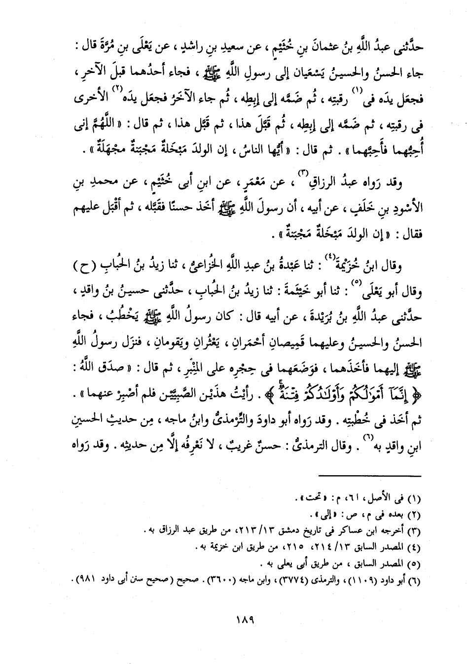 وَقَالَ ابْنُ خُزَيْمَةَ ثَنَا عَبْدَةُ بْنُ عَبْدِ اللَّهِ الْخُزَاعِيُّ، ثَنَا زَيْدُ بْنُ الْحُبَابِ (ح) وَقَالَ أَبُو يَعْلَى: ثَنَا أَبُو خَيْثَمَةَ: ثَنَا زَيْدُ بْنُ الْحُبَابِ، حَدَّثَنِي حُسَيْنُ بْنُ وَاقِدٍ، حَدَّثَنِي عَبْدُ اللَّهِ بْنُ بُرَيْدَةَ، عَنْ أَبِيهِ قَالَ: «كَانَ رَسُولُ اللَّهِ صَلَّى اللَّهُ عَلَيْهِ وَسَلَّمَ يَخْطُبُ، فَجَاءَ الْحَسَنُ وَالْحُسَيْنُ وَعَلَيْهِمَا قَمِيصَانِ أَحْمَرَانِ، يَعْثُرَانِ وَيَقُومَانِ، فَنَزَلَ رَسُولُ اللَّهِ صَلَّى اللَّهُ عَلَيْهِ وَسَلَّمَ إِلَيْهِمَا فَأَخَذَهُمَا، فَوَضَعَهُمَا فِي حِجْرِهِ عَلَى الْمِنْبَرِ، ثُمَّ قَالَ: " صَدَقَ اللَّهُ: {إِنَّمَا أَمْوَالُكُمْ وَأَوْلَادُكُمْ فِتْنَةٌ} [التغابن: 15] . رَأَيْتُ هَذَيْنِ الصَّبَّيْنِ فَلَمْ أَصْبِرْ عَنْهُمَا ". ثُمَّ أَخَذَ فِي خُطْبَتِهِ» وَقَدْ رَوَاهُ أَبُو دَاوُدَ وَالتِّرْمِذِيُّ وَابْنُ مَاجَهْ، مِنْ حَدِيثِ الْحُسَيْنِ بْنِ وَاقِدٍ بِهِ. وَقَالَ التِّرْمِذِيُّ: حَسَنٌ غَرِيبٌ، لَا نَعْرِفُهُ إِلَّا مِنْ حَدِيثِهِ. وَقَدْ رَوَاهُ