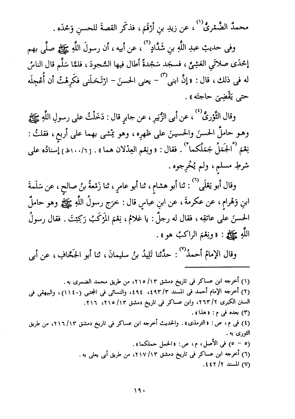 وَقَالَ الثَّوْرِيُّ، عَنْ أَبِي الزُّبَيْرِ، عَنْ جَابِرٍ قَالَ: «دَخَلْتُ عَلَى رَسُولِ اللَّهِ صَلَّى اللَّهُ عَلَيْهِ وَسَلَّمَ وَهُوَ حَامِلٌ الْحَسَنَ وَالْحُسَيْنَ عَلَى ظَهْرِهِ، وَهُوَ يَمْشِي بِهِمَا عَلَى أَرْبَعٍ، فَقُلْتُ: نِعْمَ الْجَمَلُ جَمَلُكُمَا. فَقَالَ: " وَنِعْمَ الْعَدْلَانِ هُمَا» . إِسْنَادُهُ عَلَى شَرْطِ مُسْلِمٍ، وَلَمْ يُخْرِجُوهُ.