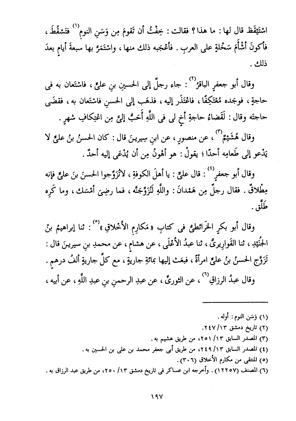 وَقَالَ أَبُو بَكْرٍ الْخَرَائِطِيُّ فِي كِتَابِ " مَكَارِمِ الْأَخْلَاقِ ": ثَنَا إِبْرَاهِيمُ بْنُ الْجُنَيْدِ، ثَنَا الْقَوَارِيرِيُّ، ثَنَا عَبْدُ الْأَعْلَى، عَنْ هِشَامٍ، عَنْ مُحَمَّدِ بْنِ سِيرِينَ قَالَ: تَزَوَّجَ الْحَسَنُ بْنُ عَلِيٍّ امْرَأَةً، فَبَعَثَ إِلَيْهَا بِمِائَةِ جَارِيَةٍ، مَعَ كُلِّ جَارِيَةٍ أَلْفُ دِرْهَمٍ.