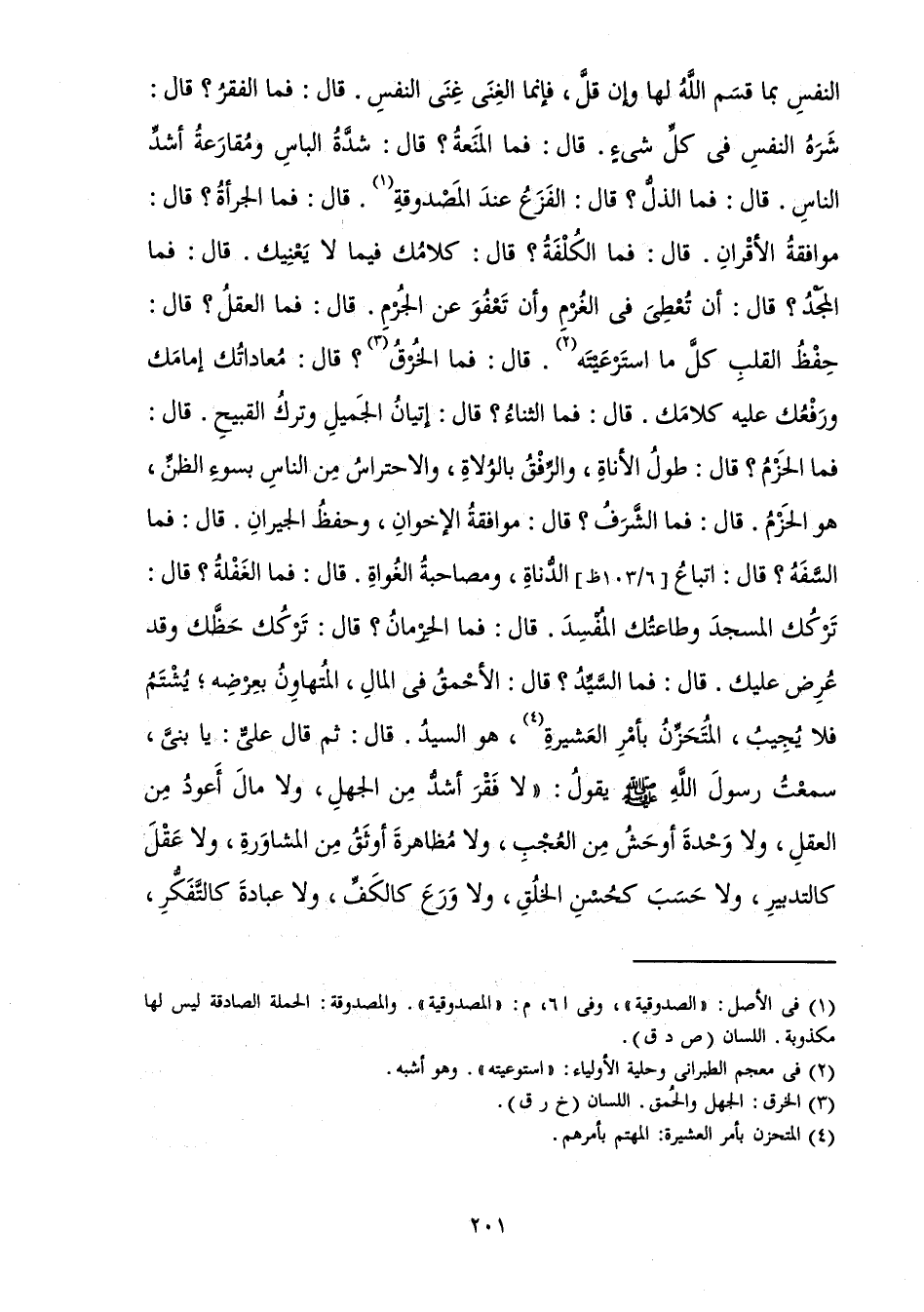 النَّفْسِ بِمَا قَسَمَ اللَّهُ لَهَا وَإِنْ قَلَّ، فَإِنَّمَا الْغِنَى غِنَى النَّفْسِ. قَالَ: فَمَا الْفَقْرُ؟ قَالَ: شَرَهُ النَّفْسِ فِي كُلِّ شَيْءٍ. قَالَ: فَمَا الْمَنَعَةُ؟ قَالَ: شِدَّةُ الْبَأْسِ وَمُقَارَعَةُ أَشَدِّ النَّاسِ. قَالَ: فَمَا الذُّلُّ؟ قَالَ: الْفَزَعُ عِنْدَ الْمَصْدُوقَةِ. قَالَ: فَمَا الْجُرْأَةُ؟ قَالَ: مُوَافَقَةُ الْأَقْرَانِ. قَالَ: فَمَا الْكُلْفَةُ؟ قَالَ: كَلَامُكَ فِيمَا لَا يَعْنِيكَ. قَالَ: فَمَا الْمَجْدُ؟ قَالَ: أَنْ تُعْطِي فِي الْغُرْمِ وَأَنْ تَعْفُوَ عَنِ الْجُرْمِ. قَالَ: فَمَا الْعَقْلُ؟ قَالَ: حِفْظُ الْقَلْبِ كُلَّ مَا اسْتَرْعَيْتَهُ. قَالَ: فَمَا الْخُرْقُ؟ قَالَ: مُعَادَاتُكَ إِمَامَكَ وَرَفْعُكَ عَلَيْهِ كَلَامَكَ. قَالَ: فَمَا الثَّنَاءُ؟ قَالَ: إِتْيَانُ الْجَمِيلِ وَتَرْكُ الْقَبِيحِ. قَالَ: فَمَا الْحَزْمُ؟ قَالَ: طُولُ الْأَنَاةِ، وَالرِّفْقُ بِالْوُلَاةِ، وَالِاحْتِرَاسُ مِنَ النَّاسِ بِسُوءِ الظَّنِّ، هُوَ الْحَزْمُ. قَالَ: فَمَا الشَّرَفُ؟ قَالَ: مُوَافَقَةُ الْإِخْوَانِ، وَحِفْظُ الْجِيرَانِ. قَالَ: فَمَا السَّفَهُ؟ قَالَ: اتِّبَاعُ الدُّنَاةِ، وَمُصَاحَبَةُ الْغُوَاةِ. قَالَ: فَمَا الْغَفْلَةُ؟ قَالَ: تَرْكُكَ الْمَسْجِدَ وَطَاعَتُكَ الْمُفْسِدَ. قَالَ: فَمَا الْحِرْمَانُ؟ قَالَ: تَرْكُكَ حَظَّكَ وَقَدْ عُرِضَ عَلَيْكَ. قَالَ: فَمَا السَّيِّدُ؟ قَالَ: الْأَحْمَقُ فِي الْمَالِ، الْمُتَهَاوِنُ بِعِرْضِهِ ; يُشْتَمُ فَلَا يُجِيبُ، الْمُتَحَزِّنُ بِأَمْرِ الْعَشِيرَةِ، هُوَ السَّيِّدُ. قَالَ: ثُمَّ قَالَ عَلِيٌّ: يَا بُنَيَّ، سَمِعْتُ رَسُولَ اللَّهِ صَلَّى اللَّهُ عَلَيْهِ وَسَلَّمَ يَقُولُ: " «لَا فَقْرَ أَشَدُّ مِنَ الْجَهْلِ، وَلَا مَالَ أَعْوَدُ مِنَ الْعَقْلِ، وَلَا وَحْدَةَ أَوْحَشُ مِنَ الْعُجْبِ، وَلَا مُظَاهَرَةَ أَوْثَقُ مِنَ الْمُشَاوَرَةِ، وَلَا عَقْلَ كَالتَّدْبِيرِ، وَلَا حَسَبَ كَحُسْنِ الْخُلُقِ، وَلَا وَرَعَ كَالْكَفِّ، وَلَا عِبَادَةَ كَالتَّفَكُّرِ،
