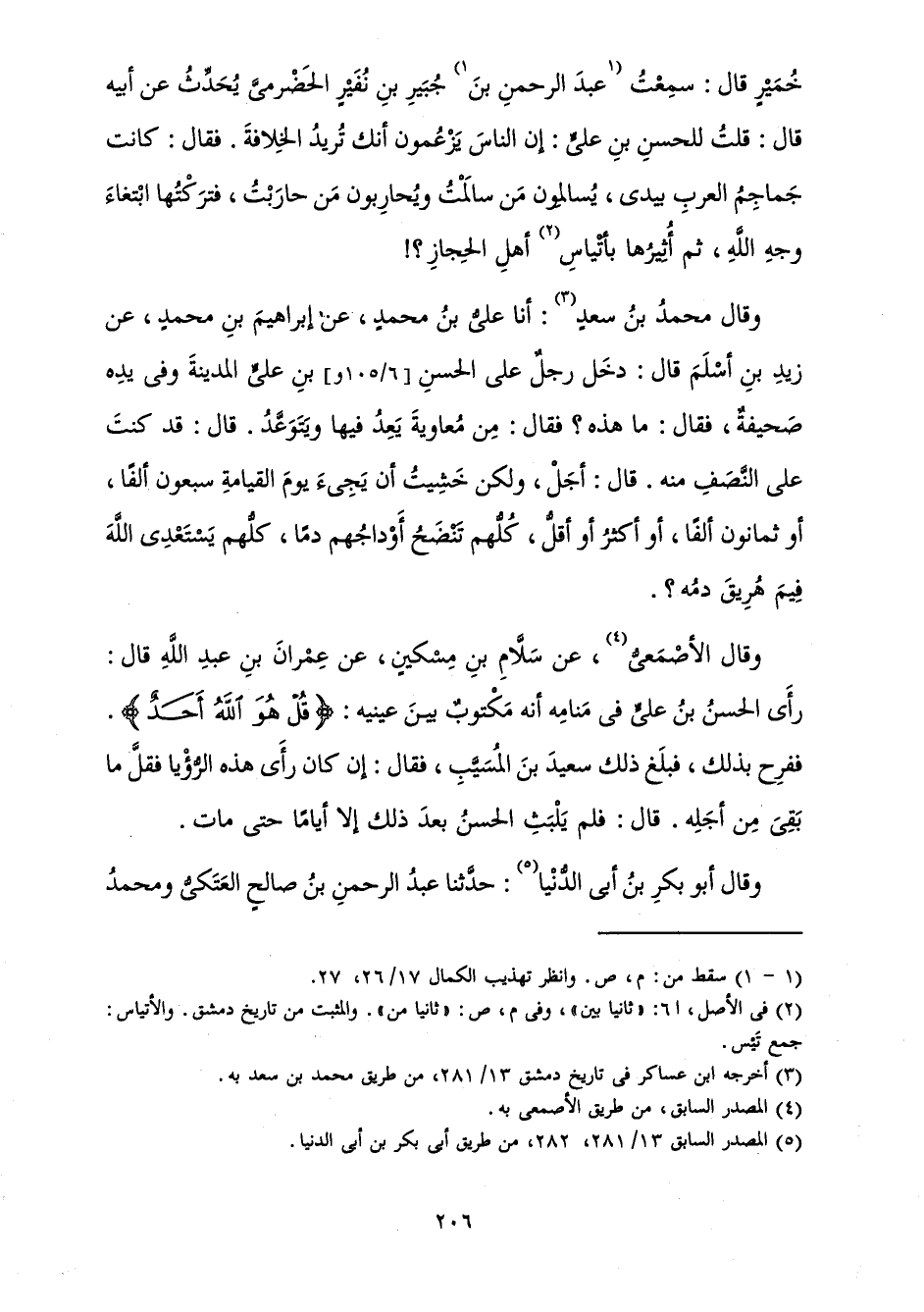خُمَيْرٍ قَالَ: سَمِعْتُ عَبْدَ الرَّحْمَنِ بْنَ جُبَيْرِ بْنِ نُفَيرٍ الْحَضْرَمِيَّ يُحَدِّثُ عَنْ أَبِيهِ قَالَ: قُلْتُ لِلْحَسَنِ بْنِ عَلِيٍّ: إِنَّ النَّاسَ يَزْعُمُونَ أَنَّكَ تُرِيدُ الْخِلَافَةَ. فَقَالَ: كَانَتْ جَمَاجِمُ الْعَرَبِ بِيَدِي، يُسَالِمُونَ مَنْ سَالَمْتُ وَيُحَارِبُونَ مَنْ حَارَبْتُ، فَتَرَكْتُهَا ابْتِغَاءَ وَجْهِ اللَّهِ، ثُمَّ أُثِيرُهَا بِأَتْيَاسِ أَهْلِ الْحِجَازِ؟ !