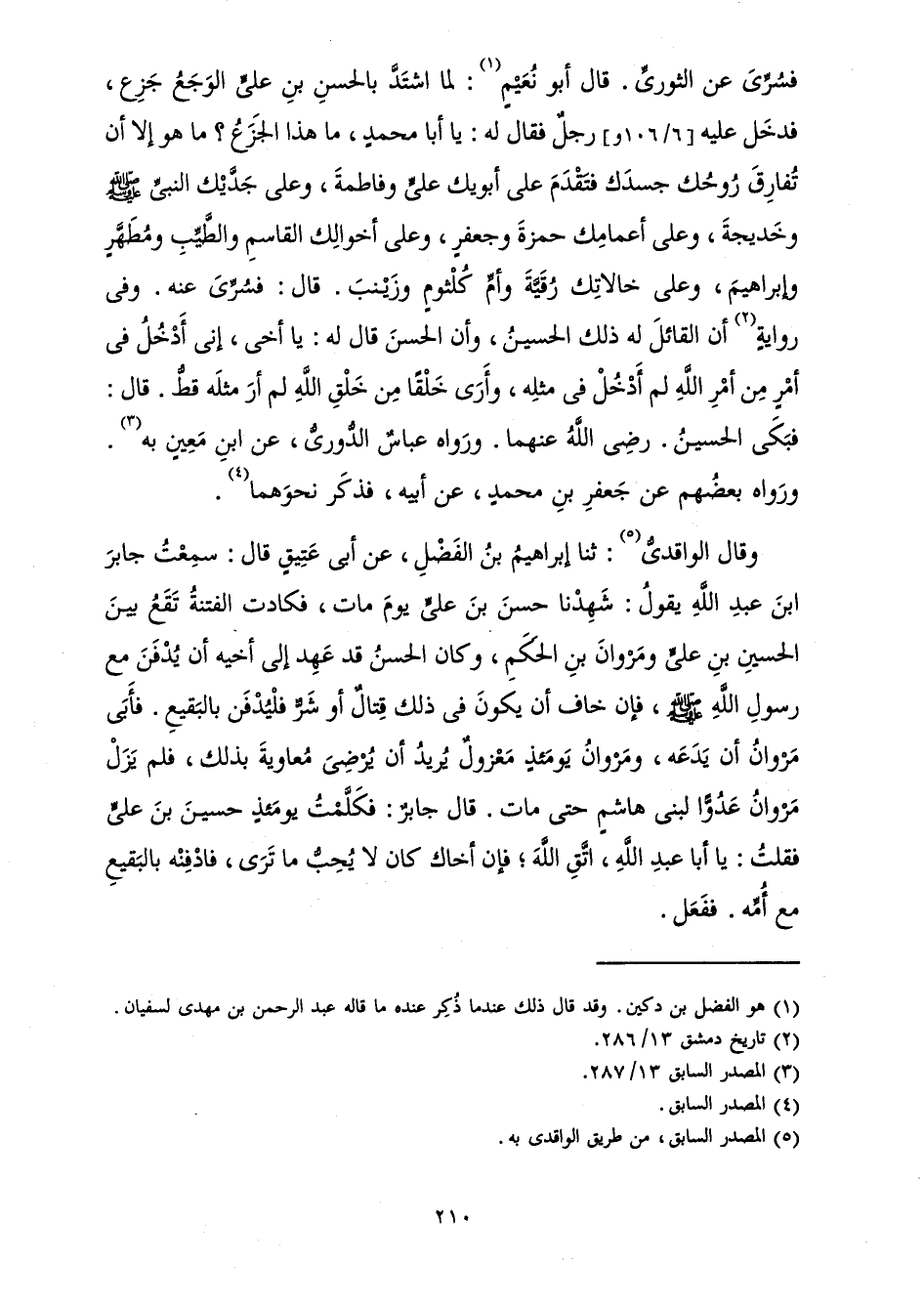 فَسُرِّيَ عَنِ الثَّوْرِيِّ. قَالَ أَبُو نُعَيْمٍ: لَمَّا اشْتَدَّ بِالْحَسَنِ بْنِ عَلِيٍّ الْوَجَعُ جَزِعَ، فَدَخَلَ عَلَيْهِ رَجُلٌ فَقَالَ لَهُ: يَا أَبَا مُحَمَّدٍ، مَا هَذَا الْجَزَعُ؟ مَا هُوَ إِلَّا أَنْ تُفَارِقَ رُوحُكَ جَسَدَكَ فَتَقْدَمَ عَلَى أَبَوَيْكَ عَلِيٍّ وَفَاطِمَةَ، وَعَلَى جَدَّيْكَ النَّبِيِّ صَلَّى اللَّهُ عَلَيْهِ وَسَلَّمَ وَخَدِيجَةَ، وَعَلَى أَعْمَامِكَ حَمْزَةَ وَجَعْفَرٍ، وَعَلَى أَخْوَالِكَ الْقَاسِمِ وَالطَّيِّبِ وَمُطَهِّرٍ وَإِبْرَاهِيمَ، وَعَلَى خَالَاتِكَ رُقَيَّةَ وَأُمِّ كُلْثُومٍ وَزَيْنَبَ. قَالَ: فَسُرِّيَ عَنْهُ. وَفِي رِوَايَةٍ أَنَّ الْقَائِلَ لَهُ ذَلِكَ الْحُسَيْنُ، وَأَنَّ الْحَسَنَ قَالَ لَهُ: يَا أَخِي، إِنِّي أَدْخُلُ فِي أَمْرٍ مِنْ أَمْرِ اللَّهِ لَمْ أَدْخُلْ فِي مَثَلِهِ، وَأَرَى خَلْقًا مِنْ خَلْقِ اللَّهِ لَمْ أَرَ مَثَلَهُ قَطُّ. قَالَ: فَبَكَى الْحُسَيْنُ. رَضِيَ اللَّهُ عَنْهُمَا. وَرَوَاهُ عَبَّاسُ الدُّورِيُّ، عَنِ ابْنِ مَعِينٍ بِهِ. وَرَوَاهُ بَعْضُهُمْ عَنْ جَعْفَرِ بْنِ مُحَمَّدٍ، عَنْ أَبِيهِ، فَذَكَرَ نَحْوَهُمَا.