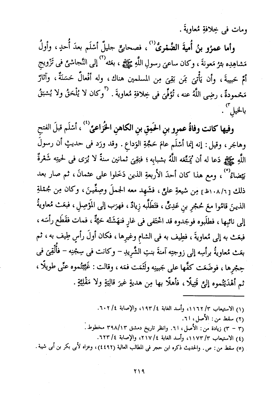 وَفِيهَا كَانَتْ وَفَاةُ عَمْرِو بْنِ الْحَمِقِ بْنِ الْكَاهِنِ الْخُزَاعِيِّ، أَسْلَمَ قَبْلَ الْفَتْحِ وَهَاجَرَ، وَقِيلَ: إِنَّهُ إِنَّمَا أَسْلَمَ عَامَ حَجَّةِ الْوَدَاعِ. وَقَدْ وَرَدَ فِي حَدِيثٍ أَنَّ رَسُولَ اللَّهِ صَلَّى اللَّهُ عَلَيْهِ وَسَلَّمَ دَعَا لَهُ أَنْ يُمَتِّعَهُ اللَّهُ بِشَبَابِهِ ; فَبَقِيَ ثَمَانِينَ سَنَةً لَا يُرَى فِي لِحْيَتِهِ شَعْرَةٌ بَيْضَاءُ، وَمَعَ هَذَا كَانَ أَحَدَ الْأَرْبَعَةِ الَّذِينَ دَخَلُوا عَلَى عُثْمَانَ، ثُمَّ صَارَ بَعْدَ ذَلِكَ مِنْ شِيعَةِ عَلِيٍّ، فَشَهِدَ مَعَهُ الْجَمَلَ وَصِفِّينَ، وَكَانَ مِنْ جُمْلَةِ الَّذِينَ قَامُوا مَعَ حُجْرِ بْنِ عَدِيٍّ، فَتَطَلَّبَهُ زِيَادٌ، فَهَرَبَ إِلَى الْمَوْصِلِ، فَبَعَثَ مُعَاوِيَةُ إِلَى نَائِبِهَا، فَطَلَبُوهُ فَوَجَدُوهُ قَدِ اخْتَفَى فِي غَارٍ فَنَهَشَتْهُ حَيَّةٌ، فَمَاتَ فَقَطَعَ رَأْسَهُ، فَبَعَثَ بِهِ إِلَى مُعَاوِيَةَ، فَطِيفَ بِهِ فِي الشَّامِ وَغَيْرِهَا، فَكَانَ أَوَّلَ رَأْسٍ طِيفَ بِهِ، ثُمَّ بَعَثَ مُعَاوِيَةُ بِرَأْسِهِ إِلَى زَوْجَتِهِ آمِنَةَ بِنْتِ الشَّرِيدِ - وَكَانَتْ فِي سِجْنِهِ - فَأُلْقِيَ فِي حِجْرِهَا، فَوَضَعَتْ كَفَّهَا عَلَى جَبِينِهِ وَلَثَمَتْ فَمَهُ، وَقَالَتْ: غَيَّبْتُمُوهُ عَنِّي طَوِيلًا، ثُمَّ أَهْدَيْتُمُوهُ إِلَيَّ قَتِيلًا، فَأَهْلًا بِهَا مِنْ هَدِيَّةٍ غَيْرَ قَالِيَةٍ وَلَا مَقْلِيَّةٍ.