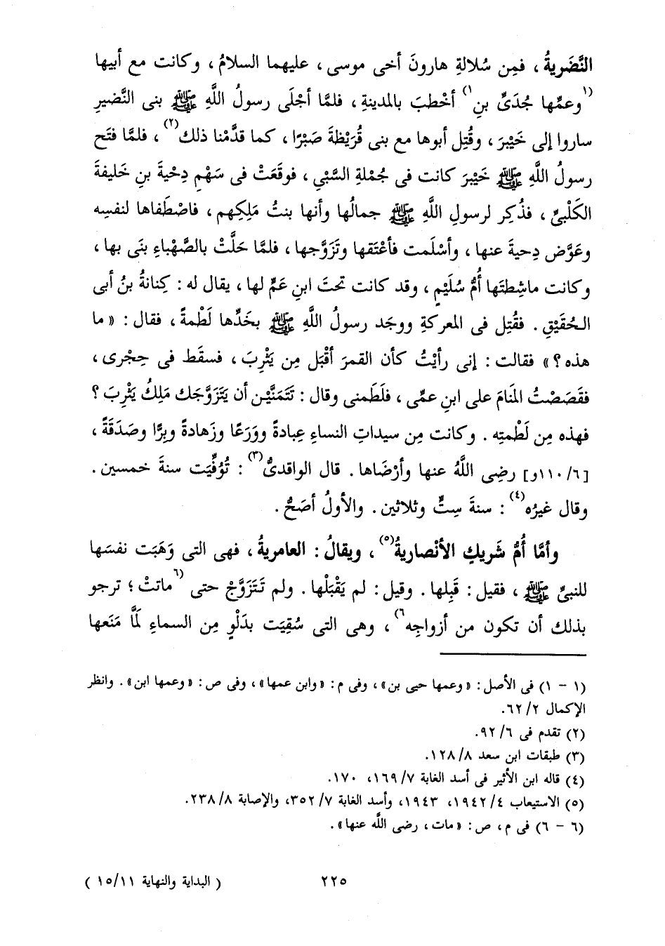 النَّضَرِيةُ، فَمِنْ سُلَالَةِ هَارُونَ أَخِي مُوسَى، عَلَيْهِمَا السَّلَامُ، وَكَانَتْ مَعَ أَبِيهَا وَعَمِّهَا جُدَيِّ بْنِ أَخْطَبَ بِالْمَدِينَةِ، فَلَمَّا أَجْلَى رَسُولُ اللَّهِ صَلَّى اللَّهُ عَلَيْهِ وَسَلَّمَ بَنِي النَّضِيرِ سَارُوا إِلَى خَيْبَرَ وَقُتِلَ أَبُوهَا مَعَ بَنِي قُرَيْظَةَ صَبْرًا، كَمَا قَدَّمْنَا ذَلِكَ، فَلَمَّا فَتَحَ رَسُولُ اللَّهِ صَلَّى اللَّهُ عَلَيْهِ وَسَلَّمَ خَيْبَرَ كَانَتْ فِي جُمْلَةِ السَّبْيِ، فَوَقَعَتْ فِي سَهْمِ دِحْيَةَ بْنِ خَلِيفَةَ الْكَلْبِيِّ، فَذَكَرَ لِرَسُولِ اللَّهِ صَلَّى عَلَيْهِ وَسَلَّمَ جَمَالَهَا وَأَنَّهَا بِنْتُ مَلِكِهِمْ، فَاصْطَفَاهَا لِنَفْسِهِ وَعَوَّضَ دِحْيَةَ عَنْهَا، وَأَسْلَمَتْ فَأَعْتَقَهَا وَتَزَوَّجَهَا، فَلَمَّا حَلَّتْ بِالصَّهْبَاءِ بَنَى بِهَا، وَكَانَتْ مَاشِطَتَهَا أُمُّ سُلَيْمٍ، وَقَدْ كَانَتْ تَحْتَ ابْنِ عَمٍّ لَهَا، يُقَالُ لَهُ: كِنَانَةُ بْنُ أَبِي الْحُقَيْقِ. فَقُتِلَ فِي الْمَعْرَكَةِ وَوَجَدَ رَسُولُ اللَّهِ صَلَّى اللَّهُ عَلَيْهِ وَسَلَّمَ بِخَدِّهَا لَطْمَةً، فَقَالَ: " مَا هَذِهِ؟ " فَقَالَتْ: إِنِّي رَأَيْتُ كَأَنَّ الْقَمَرَ أَقْبَلَ مِنْ يَثْرِبَ، فَسَقَطَ فِي حِجْرِي، فَقَصَصْتُ الْمَنَامَ عَلَى ابْنِ عَمِّي، فَلَطَمَنِي وَقَالَ: تَتَمَنَّيْنَ أَنْ يَتَزَوَّجَكِ مَلِكُ يَثْرِبَ؟ فَهَذِهِ مِنْ لَطْمَتِهِ. وَكَانَتْ مِنْ سَيِّدَاتِ النِّسَاءِ عِبَادَةً وَوَرَعًا وَزَهَادَةً وَبِرًّا وَصَدَقَةً، رَضِيَ اللَّهُ عَنْهَا وَأَرْضَاهَا. قَالَ الْوَاقِدِيُّ: تُوُفِّيَتْ سَنَةَ خَمْسِينَ. وَقَالَ غَيْرُهُ: سَنَةَ سِتٍّ وَثَلَاثِينَ. وَالْأَوَّلُ أَصَحُّ.