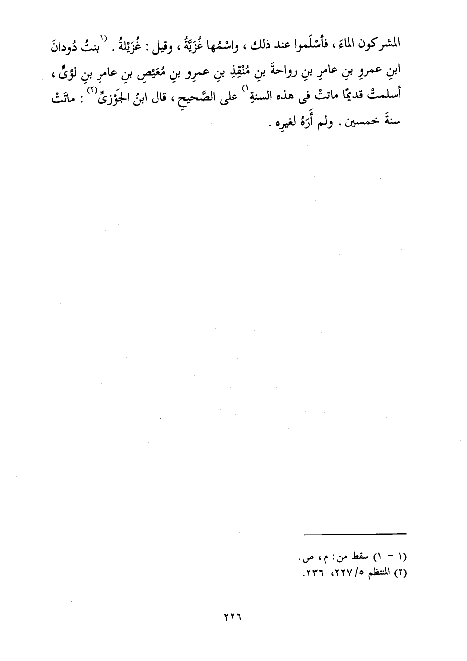 الْمُشْرِكُونَ الْمَاءَ، فَأَسْلَمُوا عِنْدَ ذَلِكَ، وَاسْمُهَا غُزَيَّةُ، وَقِيلَ: عُزَيْلَةُ. بِنْتُ دُودَانَ بْنِ عَمْرِو بْنِ عَامِرِ بْنِ رَوَاحَةَ بْنِ مُنْقِذِ بْنِ عَمْرِو بْنِ مُعَيْصِ بْنِ عَامِرِ بْنِ لُؤَيٍّ، أَسْلَمَتْ قَدِيمًا مَاتَتْ فِي هَذِهِ السَّنَةِ عَلَى الصَّحِيحِ، قَالَ ابْنُ الْجَوْزِيِّ: مَاتَتْ سَنَةَ خَمْسِينَ، وَلَمْ أَرَهُ لِغَيْرِهِ.