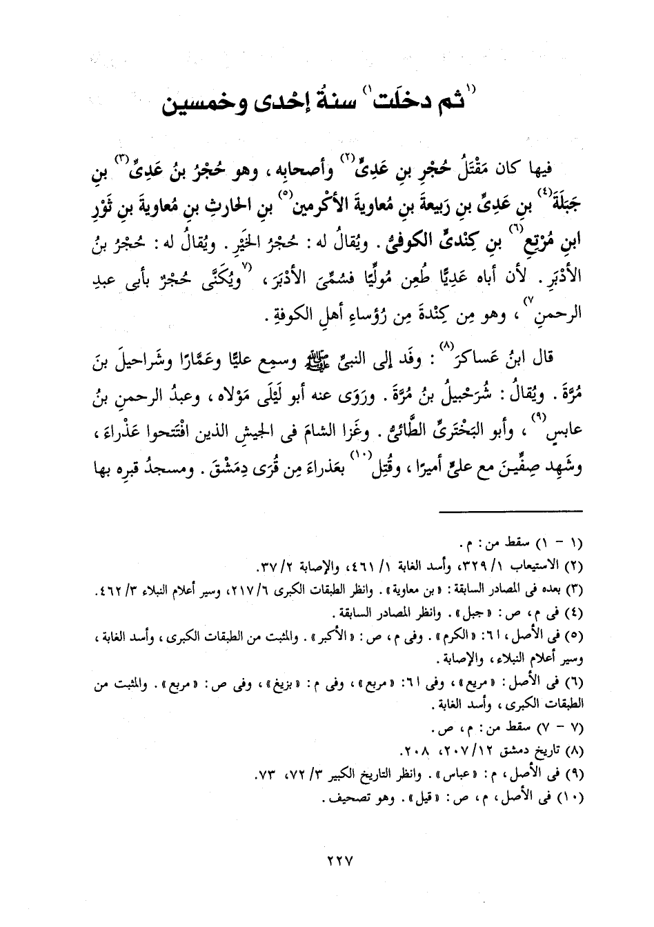 فِيهَا كَانَ مَقْتَلُ حُجْرِ بْنِ عَدِيٍّ وَأَصْحَابُهُ، وَهُوَ حُجْرُ بْنُ عَدِيِّ بْنِ جَبَلَةَ بْنِ عَدِيِّ بْنِ رَبِيعَةَ بْنِ مُعَاوِيَةَ الْأَكْرَمِينِ بْنِ الْحَارِثِ بْنِ مُعَاوِيَةَ بْنِ ثَوْرِ بْنِ مَرْتَعِ بْنِ كِنْدِيٍّ الْكُوفِيُّ. وَيُقَالُ لَهُ: حُجْرُ الْخَيْرِ. وَيُقَالُ لَهُ: حُجْرُ بْنُ الْأَدْبَرِ. لِأَنَّ أَبَاهُ عَدِيٍّا طُعِنَ مُولِّيًا فَسُمِّيَ الْأَدْبَرَ، وَيُكَنَّى حُجْرٌ بِأَبِي عَبْدِ الرَّحْمَنِ، وَهُوَ مِنْ كِنْدَةَ مِنْ رُؤَسَاءِ أَهْلِ الْكُوفَةِ.