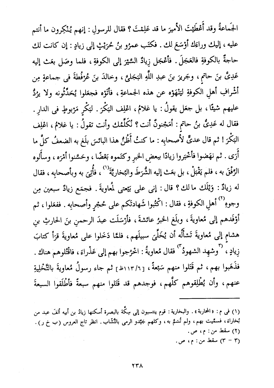 الْجَمَاعَةُ وَقَدْ أَعْطَيْتَ الْأَمِيرَ مَا قَدْ عَلِمْتَ؟ فَقَالَ لِلرَّسُولِ: إِنَّهُمْ يُنْكِرُونَ مَا أَنْتُمْ عَلَيْهِ، إِلَيْكَ وَرَاءَكَ أَوْسَعَ لَكَ. فَكَتَبَ عَمْرُو بْنُ حُرَيْثٍ إِلَى زِيَادٍ: إِنْ كَانَتْ لَكَ حَاجَةٌ بِالْكُوفَةِ فَالْعَجَلَ. فَأَعْجَلَ زِيَادٌ السَّيْرَ إِلَى الْكُوفَةِ، فَلَمَّا وَصَلَ بَعَثَ إِلَيْهِ عَدِيَّ بْنَ حَاتِمٍ وَجَرِيرَ بْنَ عَبْدِ اللَّهِ الْبَجَلِيَّ، وَخَالِدَ بْنَ عُرْفُطَةَ فِي جَمَاعَةٍ مِنْ أَشْرَافِ أَهْلِ الْكُوفَةِ لِيَنْهَوْهُ عَنْ هَذِهِ الْجَمَاعَةِ، فَأَتَوْهُ فَجَعَلُوا يُحَدِّثُونَهُ وَلَا يَرُدُّ عَلَيْهِمْ شَيْئًا، بَلْ جَعَلَ يَقُولُ: يَا غُلَامُ، اعْلِفِ الْبَكْرَ. لِبَكْرٍ مَرْبُوطٍ فِي الدَّارِ. فَقَالَ لَهُ عَدِيُّ بْنُ حَاتِمٍ: أَمْجَنُونٌ أَنْتَ؟ نُكَلِّمُكَ وَأَنْتَ تَقُولُ: يَا غُلَامُ، اعْلِفِ الْبَكْرَ! ثُمَّ قَالَ عَدِيٌّ لِأَصْحَابِهِ: مَا كُنْتُ أَظُنُّ هَذَا الْبَائِسَ بَلَغَ بِهِ الضَّعْفُ كُلَّ مَا أَرَى. ثُمَّ نَهَضُوا فَأَخْبَرُوا زِيَادًا بِبَعْضِ الْخَبَرِ وَكَتَمُوهُ بَعْضًا، وَحَسَّنُوا أَمْرَهُ وَسَأَلُوهُ الرِّفْقَ بِهِ، فَلَمْ يَقْبَلْ، بَلْ بَعَثَ إِلَيْهِ الشُّرَطَ وَالْبُخَارِيَّةَ، فَأَتَى بِهِ وَبِأَصْحَابِهِ، فَقَالَ لَهُ: زِيَادٌ: وَيْلَكَ مَا لَكَ؟ قَالَ: إِنِّي عَلَى بَيْعَتِي لِمُعَاوِيَةَ. فَجَمَعَ زِيَادٌ سَبْعِينَ مِنْ وُجُوهِ أَهْلِ الْكُوفَةِ، فَقَالَ: اكْتُبُوا شَهَادَتَكُمْ عَلَى حُجْرٍ وَأَصْحَابِهِ. فَفَعَلُوا ثُمَّ أَوْفَدَهُمْ إِلَى مُعَاوِيَةَ، وَبَلَغَ الْخَبَرُ عَائِشَةَ، فَأَرْسَلَتْ عَبْدَ الرَّحْمَنِ بْنَ الْحَارِثِ بْنِ هِشَامٍ إِلَى مُعَاوِيَةَ تَسْأَلُهُ أَنْ يُخَلِّيَ سَبِيلَهُمْ، فَلَمَّا دَخَلُوا عَلَى مُعَاوِيَةَ قَرَأَ كِتَابَ زِيَادٍ، وَشَهِدَ الشُّهُودُ فَقَالَ مُعَاوِيَةُ: اخْرُجُوا بِهِمْ إِلَى عَذْرَاءَ، فَاقْتُلُوهُمْ هُنَاكَ. فَذَهَبُوا بِهِمْ، ثُمَّ قَتَلُوا مِنْهُمْ سَبْعَةً، ثُمَّ جَاءَ رَسُولُ مُعَاوِيَةَ بِالتَّخْلِيَةِ عَنْهُمْ، وَأَنْ يُطْلِقُوهُمْ كُلَّهُمْ، فَوَجَدَهُمْ قَدْ قَتَلُوا مِنْهُمْ سَبْعَةً فَأَطْلَقُوا السَّبْعَةَ