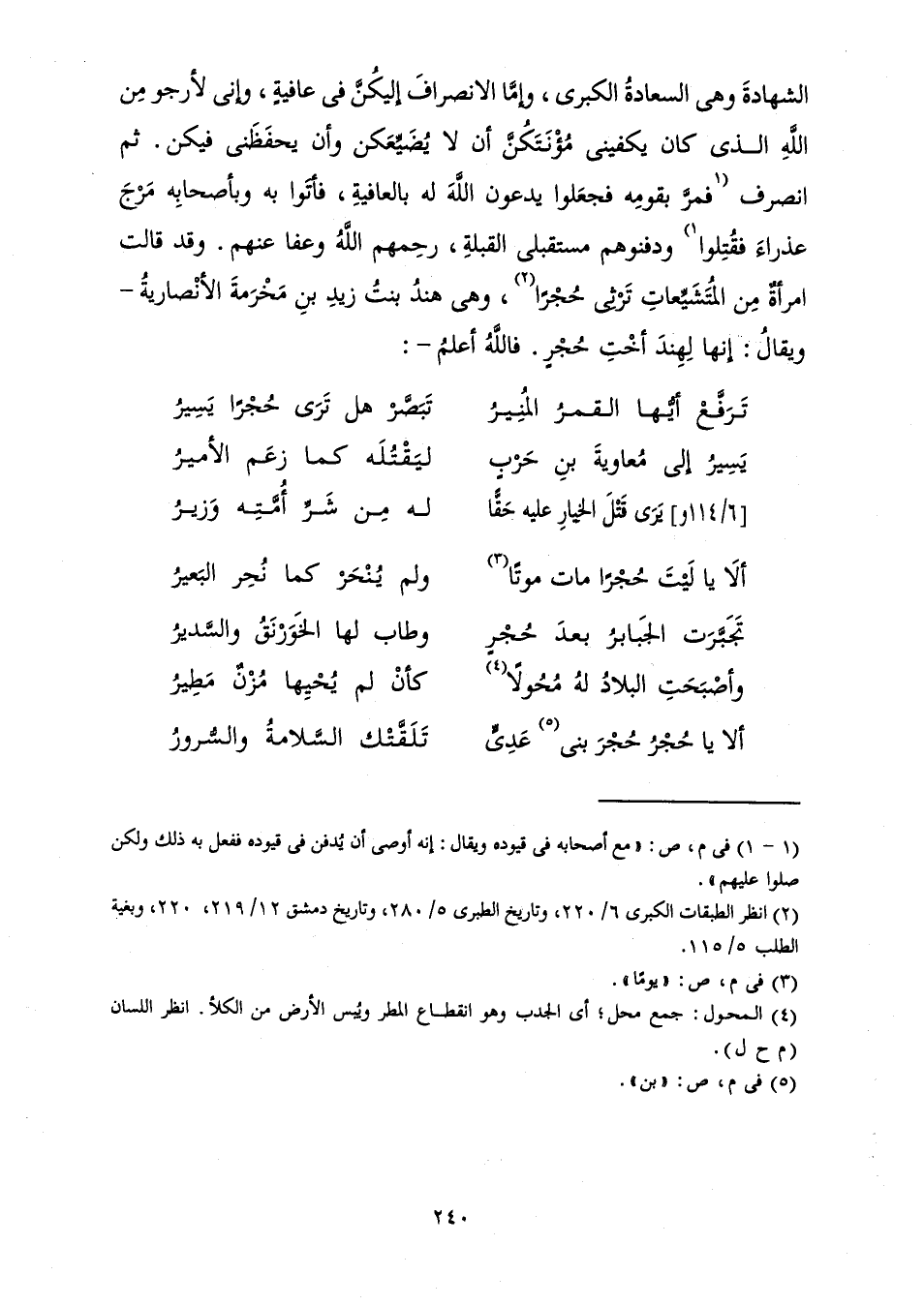 الشَّهَادَةَ وَهِيَ السَّعَادَةُ الْكُبْرَى، وَإِمَّا الِانْصِرَافَ إِلَيْكُنَّ فِي عَافِيَةٍ، وَإِنِّي لَأَرْجُو مِنَ اللَّهِ الَّذِي كَانَ يَكْفِينِي مُؤْنَتَكُنَّ أَنْ لَا يُضَيِّعَكُنَّ وَأَنْ يَحْفَظَنِي فَيْكُنَّ. ثُمَّ انْصَرَفَ فَمَرَّ بِقَوْمِهِ فَجَعَلُوا يَدْعُونَ اللَّهَ لَهُ بِالْعَافِيَةِ، فَأَتَوْا بِهِ وَبِأَصْحَابِهِ مَرْجَ عَذْرَاءَ فَقُتِلُوا وَدَفَنُوهُمْ مُسْتَقْبِلِي الْقِبْلَةِ، رَحِمَهُمُ اللَّهُ وَعَفَا عَنْهُمْ. وَقَدْ قَالَتِ امْرَأَةٌ مِنَ الْمُتَشَيِّعَاتِ تَرْثِي حُجْرًا، وَهِيَ هِنْدُ بِنْتُ زَيْدِ بْنِ مَخْرَمَةَ - الْأَنْصَارِيَّةُ - وَيُقَالُ: إِنَّهَا لِهِنْدٍ أُخْتِ حُجْرٍ. فَاللَّهُ أَعْلَمُ -: