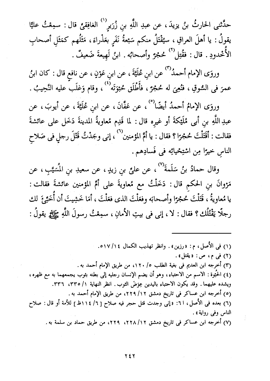 وَرَوَى الْإِمَامُ أَحْمَدُ أَيْضًا، عَنْ عَفَّانَ، عَنِ ابْنِ عُلَيَّةَ، عَنْ أَيُّوبَ، عَنْ عَبْدِ اللَّهِ بْنِ أَبِي مُلَيْكَةَ أَوْ غَيْرِهِ قَالَ: لَمَّا قَدِمَ مُعَاوِيَةُ الْمَدِينَةَ دَخَلَ عَلَى عَائِشَةَ فَقَالَتْ: أَقَتَلْتَ حُجْرًا؟ فَقَالَ: يَا أُمَّ الْمُؤْمِنِينَ، إِنِّي وَجَدْتُ قَتْلَ رَجُلٍ فِي صَلَاحِ النَّاسِ خَيْرًا مِنِ اسْتِحْيَائِهِ فِي فَسَادِهِمْ.