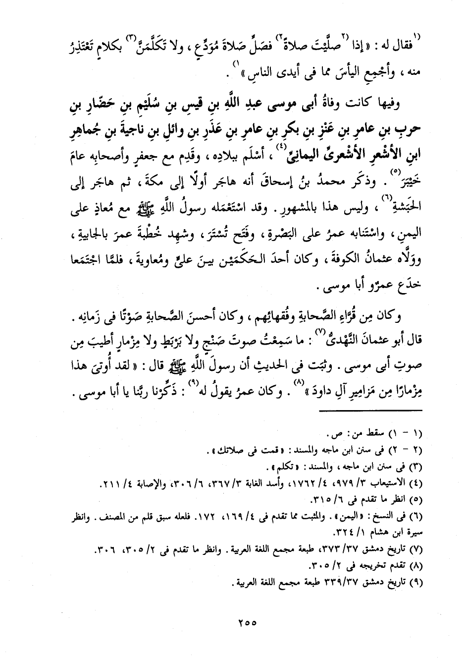 وَفِيهَا كَانَتْ وَفَاةُ أَبِي مُوسَى عَبْدِ اللَّهِ بْنِ قَيْسِ بْنِ سُلَيْمِ بْنِ حِضَارِ بْنِ حَرْبِ بْنِ عَامِرِ بْنِ عَنْزِ بْنِ بَكْرِ بْنِ عَامِرِ بْنِ عُذْرِ بْنِ وَائِلِ بْنِ نَاجِيَةِ بْنِ جُمَاهِرِ بْنِ الْأَشْعَرِ الْأَشْعَرِيِّ الْيَمَانِيِّ، أَسْلَمَ بِبِلَادِهِ، وَقَدِمَ مَعَ جَعْفَرٍ وَأَصْحَابِهِ عَامَ خَيْبَرَ. وَذَكَرَ مُحَمَّدُ بْنُ إِسْحَاقَ أَنَّهُ هَاجَرَ أَوَّلًا إِلَى مَكَّةَ، ثُمَّ هَاجَرَ إِلَى الْحَبَشَةِ، وَلَيْسَ هَذَا بِالْمَشْهُورِ. وَقَدِ اسْتَعْمَلَهُ رَسُولُ اللَّهِ صَلَّى اللَّهُ عَلَيْهِ وَسَلَّمَ مَعَ مُعَاذٍ عَلَى الْيَمَنَ، وَاسْتَنَابَهُ عُمَرُ عَلَى الْبَصْرَةِ، وَفَتَحَ تُسْتَرَ وَشَهِدَ خُطْبَةَ عُمَرَ بِالْجَابِيَةِ، وَوَلَّاهُ عُثْمَانُ الْكُوفَةَ وَكَانَ أَحَدَ الْحَكَمَيْنِ بَيْنَ عَلِيٍّ وَمُعَاوِيَةَ، فَلَمَّا اجْتَمَعَا خَدَعَ عَمْرٌو أَبَا مُوسَى.