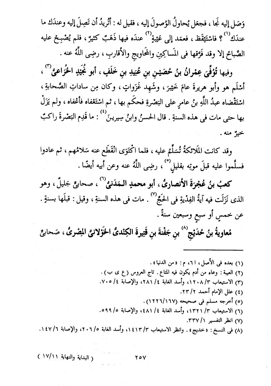 وَفِيهَا تُوُفِّيَ عِمْرَانُ بْنُ حُصَيْنِ بْنِ عُبَيْدِ بْنِ خَلَفٍ، أَبُو نُجَيدٍ الْخُزَاعِيُّ