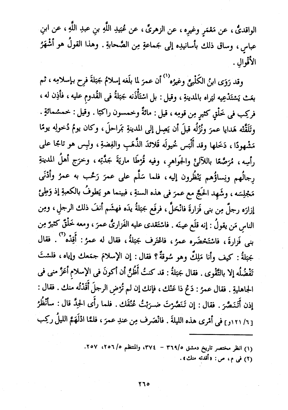 وَقَدْ رَوَى ابْنُ الْكَلْبِيِّ وَغَيْرُهُ أَنَّ عُمَرَ لَمَّا بَلَغَهُ إِسْلَامُ جَبَلَةَ فَرِحَ بِإِسْلَامِهِ، ثُمَّ بَعَثَ يَسْتَدْعِيهِ لِيَرَاهُ بِالْمَدِينَةِ، وَقِيلَ: بَلِ اسْتَأْذَنَهُ جَبَلَةُ فِي الْقُدُومِ عَلَيْهِ، فَأَذِنَ لَهُ، فَرَكِبَ فِي خَلْقٍ كَثِيرٍ مِنْ قَوْمِهِ، قِيلَ: مِائَةٌ وَخَمْسُونَ رَاكِبًا. وَقِيلَ: خَمْسُمِائَةٍ. وَتَلَقَّتْهُ هَدَايَا عُمَرَ وَنُزُلُهُ قَبْلَ أَنْ يَصِلَ إِلَى الْمَدِينَةِ بِمَرَاحِلَ، وَكَانَ يَوْمُ دُخُولِهِ يَوْمًا مَشْهُودًا، دَخَلَهَا وَقَدْ أَلْبَسَ خُيُولَهُ قَلَائِدَ الذَّهَبِ وَالْفِضَّةِ، وَلَبِسَ هُوَ تَاجًا عَلَى رَأْسِهِ، مُرَصَّعًا بِاللَّآلِئِ وَالْجَوَاهِرِ، وَفِيهِ قُرْطَا مَارِيَةَ جَدَّتِهِ، وَخَرَجَ أَهْلُ الْمَدِينَةِ رِجَالُهُمْ وَنِسَاؤُهُمْ يَنْظُرُونَ إِلَيْهِ، فَلَمَّا سَلَّمَ عَلَى عُمَرَ رَحَّبَ بِهِ عُمَرُ وَأَدْنَى مَجْلِسَهُ، وَشَهِدَ الْحَجَّ مَعَ عُمَرَ فِي هَذِهِ السَّنَةِ، فَبَيْنَمَا هُوَ يَطُوفُ بِالْكَعْبَةِ إِذْ وَطِئَ إِزَارَهُ رَجُلٌ مِنْ بَنِي فَزَارَةَ فَانْحَلَّ، فَرَفَعَ جَبَلَةُ يَدَهُ فَهَشَّمَ أَنْفَ ذَلِكَ الرَّجُلِ، وَمِنَ النَّاسِ مَنْ يَقُولُ: إِنَّهُ قَلَعَ عَيْنَهُ. فَاسْتَعْدَى عَلَيْهِ الْفَزَارِيُّ عُمَرَ، وَمَعَهُ خَلْقٌ كَثِيرٌ مِنْ بَنِي فَزَارَةَ، فَاسْتَحْضَرَهُ عُمَرُ، فَاعْتَرَفَ جَبَلَةُ فَقَالَ لَهُ عُمَرُ: أَقِدْهُ. فَقَالَ جَبَلَةُ: كَيْفَ وَأَنَا مَلِكٌ وَهُوَ سُوقَةٌ؟ فَقَالَ: إِنَّ الْإِسْلَامَ جَمَعَكَ وَإِيَّاهُ، فَلَسْتَ تَفْضُلُهُ إِلَّا بِالتَّقْوَى. فَقَالَ جَبَلَةُ قَدْ كُنْتُ أَظُنُّ أَنْ أَكُونَ فِي الْإِسْلَامِ أَعَزَّ مِنِّي فِي الْجَاهِلِيَّةِ. فَقَالَ عُمَرُ: دَعْ ذَا عَنْكَ، فَإِنَّكَ إِنْ لَمْ تُرْضِ الرَّجُلَ أَقَدْتُهُ مِنْكَ. فَقَالَ: إِذَنْ أَتَنَصَّرَ. فَقَالَ: إِنْ تَنَصَّرْتَ ضَرَبْتُ عُنُقَكَ. فَلَمَّا رَأَى الْجِدَّ قَالَ: سَأَنْظُرُ فِي أَمْرِي هَذِهِ اللَّيْلَةَ. فَانْصَرَفَ مِنْ عِنْدِ عُمَرَ، فَلَمَّا ادْلَهَمَّ اللَّيْلُ رَكِبَ