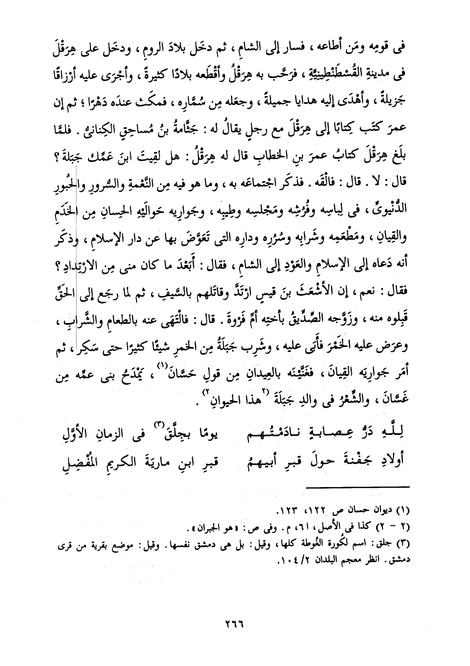 فِي قَوْمِهِ وَمَنْ أَطَاعَهُ، فَسَارَ إِلَى الشَّامِ، ثُمَّ دَخَلَ بِلَادَ الرُّومِ، وَدَخَلَ عَلَى هِرَقْلَ فِي مَدِينَةِ الْقُسْطَنْطِينِيَّةِ فَرَحَّبَ بِهِ هِرَقْلُ وَأَقْطَعَهُ بِلَادًا كَثِيرَةً، وَأَجْرَى عَلَيْهِ أَرْزَاقًا جَزِيلَةً، وَأَهْدَى إِلَيْهِ هَدَايَا جَمِيلَةً، وَجَعَلَهُ مِنْ سُمَّارِهِ، فَمَكَثَ عِنْدَهُ دَهْرًا ; ثُمَّ إِنَّ عُمَرَ كَتَبَ كِتَابًا إِلَى هِرَقْلَ مَعَ رَجُلٍ يُقَالُ لَهُ: جَثَّامَةُ بْنُ مُسَاحِقٍ الْكِنَانِيُّ. فَلَمَّا بَلَغَ هِرَقْلَ كِتَابُ عُمَرَ بْنِ الْخَطَّابِ قَالَ لَهُ هِرَقْلُ: هَلْ لَقِيتَ ابْنَ عَمِّكَ جَبَلَةَ؟ قَالَ: لَا. قَالَ: فَالْقَهُ. فَذَكَرَ اجْتِمَاعَهُ بِهِ، وَمَا هُوَ فِيهِ مِنَ النِّعْمَةِ وَالسُّرُورِ وَالْحُبُورِ الدُّنْيَوِيِّ، فِي لِبَاسِهِ وَفَرْشِهِ وَمَجْلِسِهِ وَطِيبِهِ، وَجَوَارِيهِ حَوَالَيْهِ الْحِسَانِ مِنَ الْخَدَمِ وَالْقِيَانِ، وَمَطْعَمِهِ وَشَرَابِهِ وَسُرُرِهِ وَدَارِهِ الَّتِي تَعَوَّضَ بِهَا عَنْ دَارِ الْإِسْلَامِ، وَذَكَرَ أَنَّهُ دَعَاهُ إِلَى الْإِسْلَامِ وَالْعَوْدِ إِلَى الشَّامِ فَقَالَ: أَبْعَدَ مَا كَانَ مِنِّي مِنَ الِارْتِدَادِ؟ فَقَالَ: نَعَمْ، إِنَّ الْأَشْعَثَ بْنَ قَيْسٍ ارْتَدَّ وَقَاتَلَهُمْ بِالسَّيْفِ، ثُمَّ لَمَّا رَجَعَ إِلَى الْحَقِّ قَبِلُوهُ مِنْهُ، وَزَوَّجَهُ الصِّدِّيقُ بِأُخْتِهِ أُمِّ فَرْوَةَ. قَالَ: فَالْتَهَى عَنْهُ بِالطَّعَامِ وَالشَّرَابِ، وَعَرَضَ عَلَيْهِ الْخَمْرَ فَأَبَى عَلَيْهِ، وَشَرِبَ جَبَلَةُ مِنَ الْخَمْرِ شَيْئًا كَثِيرًا حَتَّى سَكِرَ، ثُمَّ أَمَرَ جَوَارِيَهُ الْقِيَانَ، فَغَنَّيْنَهُ بِالْعِيدَانِ مِنْ قَوْلِ حَسَّانَ، يَمْدَحُ بَنِي عَمِّهِ مِنْ غَسَّانَ، وَالشِّعْرُ فِي وَالِدِ جَبَلَةَ هَذَا الْحَيَوَانِ.