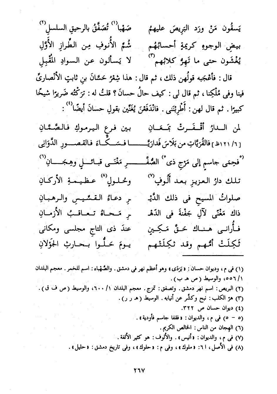 قَالَ: فَأَعْجَبَهُ قَوْلُهُنَّ ذَلِكَ، ثُمَّ قَالَ: هَذَا شِعْرُ حَسَّانَ بْنِ ثَابِتٍ الْأَنْصَارِيِّ فِينَا وَفِي مُلْكِنَا، ثُمَّ قَالَ لِي: كَيْفَ حَالُ حَسَّانَ؟ قُلْتُ لَهُ: تَرَكْتُهُ ضَرِيرًا شَيْخًا كَبِيرًا. ثُمَّ قَالَ لَهُنَّ: أَطْرِبْنَنِي. فَانْدَفَعْنَ يُغَنِّينَ بِقَوْلِ حَسَّانَ أَيْضًا: