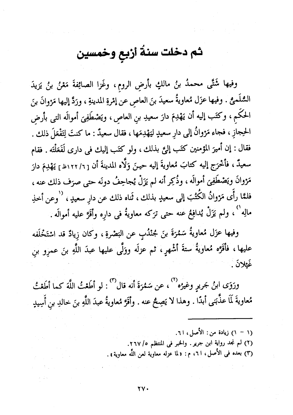 وَفِيهَا شَتَّى مُحَمَّدُ بْنُ مَالِكٍ بِأَرْضِ الرُّومِ، وَغَزَا الصَّائِفَةَ مَعْنُ بْنُ يَزِيدَ السُّلَمِيُّ. وَفِيهَا عَزَلَ مُعَاوِيَةُ سَعِيدَ بْنَ الْعَاصِ عَنْ إِمْرَةِ الْمَدِينَةِ، وَرَدَّ إِلَيْهَا مَرْوَانَ بْنَ الْحَكَمِ وَكَتَبَ إِلَيْهِ أَنْ يَهْدِمَ دَارَ سَعِيدِ بْنِ الْعَاصِ، وَيَصْطَفِي أَمْوَالَهُ الَّتِي بِأَرْضِ الْحِجَازِ، فَجَاءَ مَرْوَانُ إِلَى دَارِ سَعِيدٍ لِيَهْدِمَهَا فَقَالَ سَعِيدٌ: مَا كُنْتَ لِتَفْعَلَ ذَلِكَ. فَقَالَ: إِنَّ أَمِيرَ الْمُؤْمِنِينَ كَتَبَ إِلَيَّ بِذَلِكَ، وَلَوْ كَتَبَ إِلَيْكَ فِي دَارِي لَفَعَلْتَهُ. فَقَامَ سَعِيدٌ، فَأَخْرَجَ إِلَيْهِ كِتَابَ مُعَاوِيَةَ إِلَيْهِ حِينَ وَلَّاهُ الْمَدِينَةَ أَنْ يَهْدِمَ دَارَ مَرْوَانَ وَيَصْطَفِيَ أَمْوَالَهُ، وَذَكَرَ أَنَّهُ لَمْ يَزَلْ يُجَاحِفُ دُونَهُ حَتَّى صَرَفَ ذَلِكَ عَنْهُ، فَلَمَّا رَأَى مَرْوَانُ الْكُتُبَ إِلَى سَعِيدٍ بِذَلِكَ، ثَنَاهُ ذَلِكَ عَنْ دَارِ سَعِيدٍ، وَعَنْ أَخْذِ مَالِهِ، وَلَمْ يَزَلْ يُدَافِعُ عَنْهُ حَتَّى تَرَكَهُ مُعَاوِيَةُ فِي دَارِهِ وَأَقَرَّ عَلَيْهِ أَمْوَالَهُ.