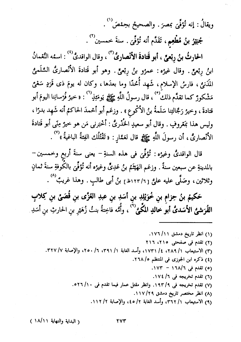 وَقَالَ الْوَاقِدِيُّ: اسْمُهُ النُّعْمَانُ بْنُ رِبْعِيٍّ. وَقَالَ غَيْرُهُ: عَمْرُو بْنُ رِبْعِيٍّ. وَهُوَ أَبُو قَتَادَةَ الْأَنْصَارِيُّ السُّلَمِيُّ الْمَدَنِيُّ فَارِسُ الْإِسْلَامِ، شَهِدَ أُحُدًا وَمَا بَعْدَهَا، وَكَانَ لَهُ يَوْمَ ذِي قَرَدٍ سَعْيٌ مَشْكُورٌ كَمَا تَقَدَّمَ ذَلِكَ، قَالَ رَسُولُ اللَّهِ صَلَّى اللَّهُ عَلَيْهِ وَسَلَّمَ يَوْمَئِذٍ: «خَيْرُ فُرْسَانِنَا الْيَوْمَ أَبُو قَتَادَةَ، وَخَيْرُ رَجَّالَتِنَا سَلَمَةُ بْنُ الْأَكْوَعِ ".» وَزَعَمَ أَبُو أَحْمَدَ الْحَاكِمُ أَنَّهُ شَهِدَ بَدْرًا، وَلَيْسَ هَذَا بِمَعْرُوفٍ. وَقَالَ أَبُو سَعِيدٍ الْخُدْرِيُّ: أَخْبَرَنِي مَنْ هُوَ خَيْرٌ مِنِّي أَبُو قَتَادَةَ الْأَنْصَارِيُّ، أَنَّ رَسُولَ اللَّهِ صَلَّى اللَّهُ عَلَيْهِ وَسَلَّمَ قَالَ لِعَمَّارٍ: «تَقْتُلُكَ الْفِئَةُ الْبَاغِيَةُ ".»