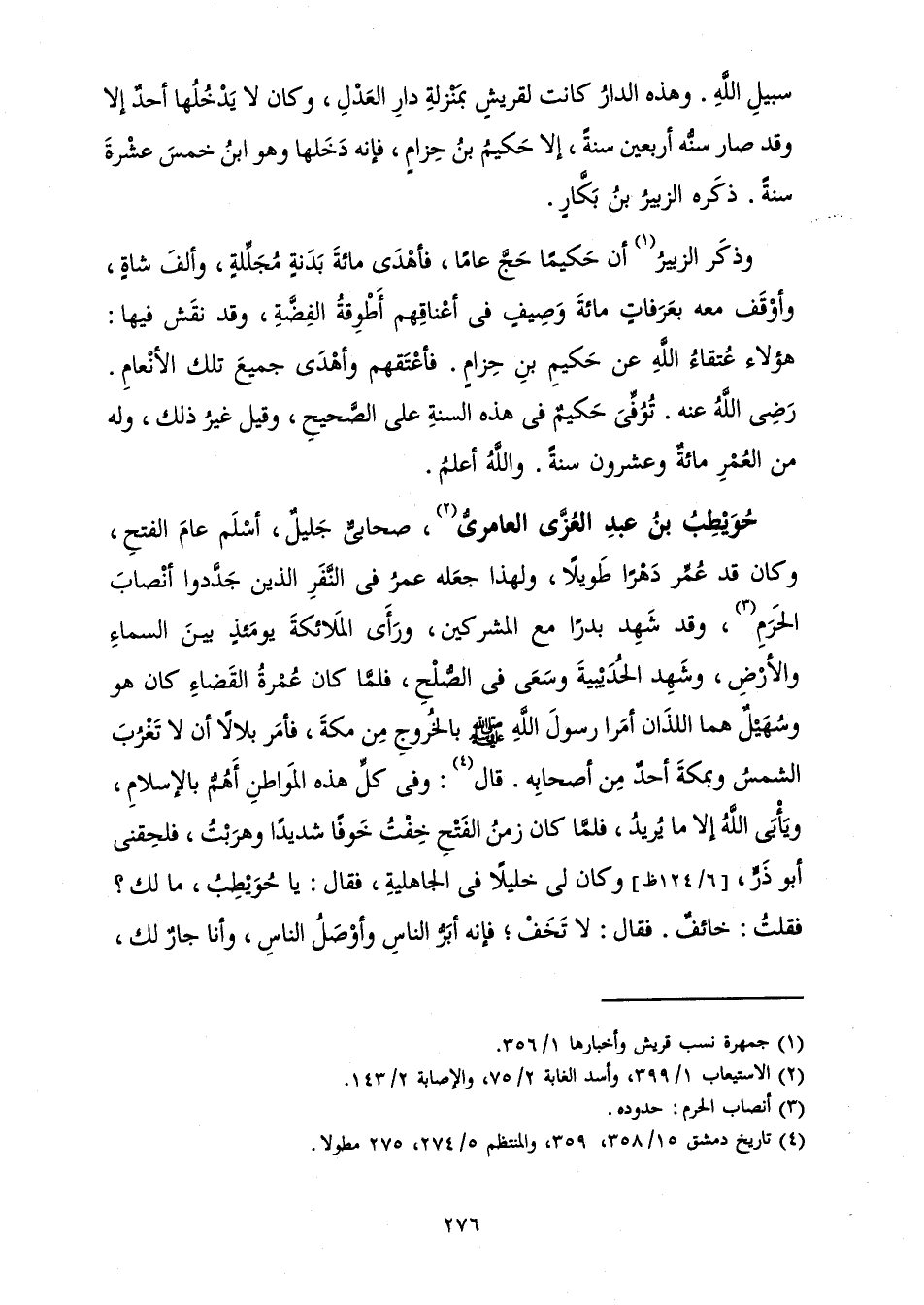 صَحَابِيٌّ جَلِيلٌ، أَسْلَمَ عَامَ الْفَتْحِ، وَكَانَ قَدْ عُمِّرَ دَهْرًا طَوِيلًا، وَلِهَذَا جَعَلَهُ عُمَرُ فِي النَّفَرِ الَّذِينَ جَدَّدُوا أَنْصَابَ الْحَرَمِ، وَقَدْ شَهِدَ بَدْرًا مَعَ الْمُشْرِكِينَ، وَرَأَى الْمَلَائِكَةَ يَوْمَئِذٍ بَيْنَ السَّمَاءِ وَالْأَرْضِ، وَشَهِدَ الْحُدَيْبِيَةَ وَسَعَى فِي الصُّلْحِ «، فَلَمَّا كَانَ عُمْرَةُ الْقَضَاءِ كَانَ هُوَ وَسُهَيْلٌ هُمَا اللَّذَانِ أَمَرَا رَسُولَ اللَّهِ صَلَّى اللَّهُ عَلَيْهِ وَسَلَّمَ بِالْخُرُوجِ مِنْ مَكَّةَ، فَأَمَرَ بِلَالًا أَنْ لَا تَغْرُبَ الشَّمْسُ وَبِمَكَّةَ أَحَدٌ مِنْ أَصْحَابِهِ. قَالَ: وَفِي كُلِّ هَذِهِ الْمَوَاطِنِ أَهُمُّ بِالْإِسْلَامِ، وَيَأْبَى اللَّهُ إِلَّا مَا يُرِيدُ، فَلَمَّا كَانَ زَمَنُ الْفَتْحِ خِفْتُ خَوْفًا شَدِيدًا وَهَرَبْتُ، فَلَحِقَنِي أَبُو ذَرٍّ، وَكَانَ لِي خَلِيلًا فِي الْجَاهِلِيَّةِ، فَقَالَ: يَا حُوَيْطِبُ، مَا لَكَ؟ فَقُلْتُ: خَائِفٌ. فَقَالَ: لَا تَخَفْ ; فَإِنَّهُ أَبَرُّ النَّاسِ وَأَوْصَلُ النَّاسِ، وَأَنَا جَارٌ لَكَ،