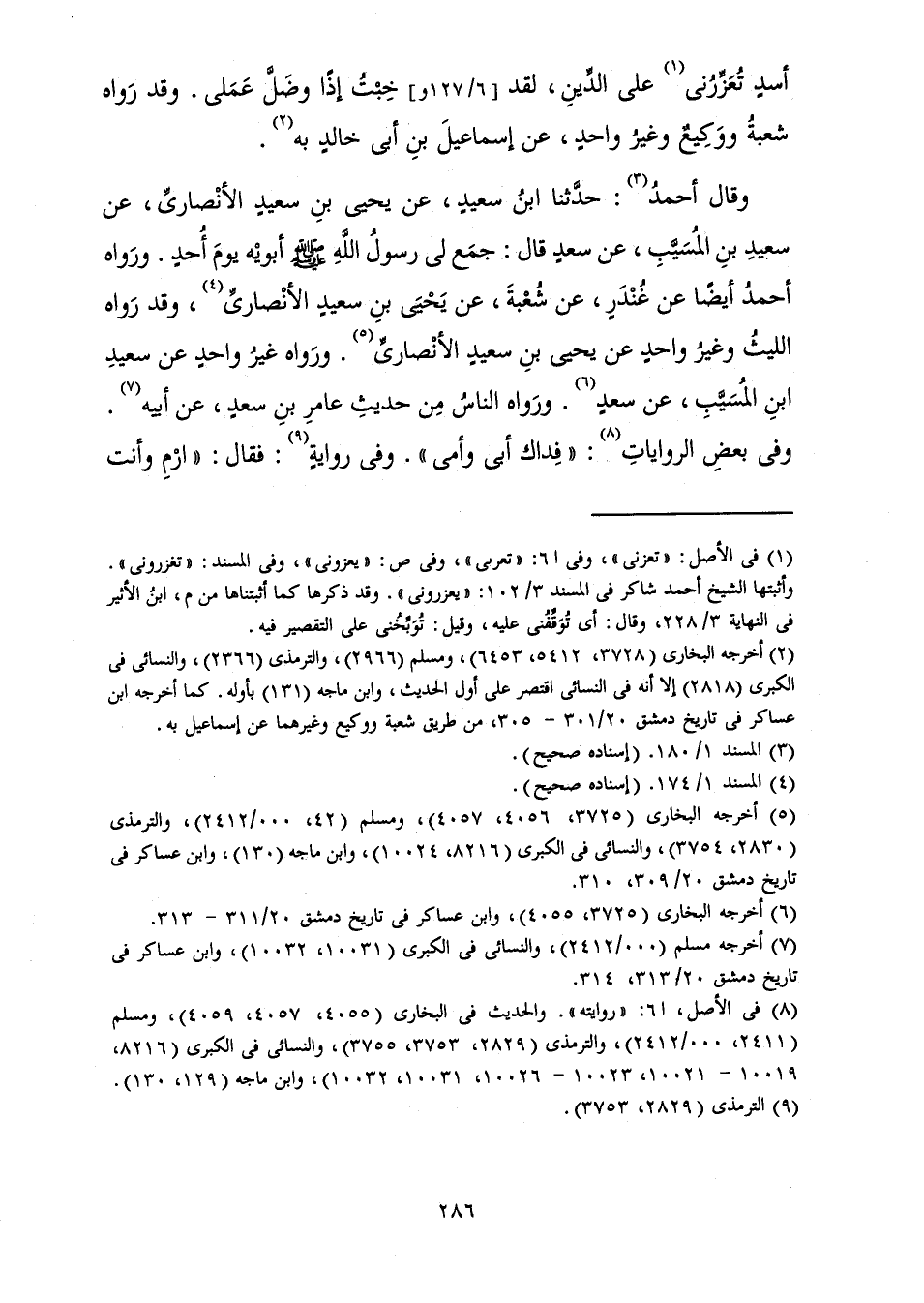 وَقَالَ أَحْمَدُ: حَدَّثَنَا ابْنُ سَعِيدٍ، عَنْ يَحْيَى بْنِ سَعِيدٍ الْأَنْصَارِيِّ، عَنْ سَعِيدِ بْنِ الْمُسَيَّبِ، عَنْ سَعْدٍ قَالَ: جَمَعَ لِي رَسُولُ اللَّهِ صَلَّى اللَّهُ عَلَيْهِ وَسَلَّمَ أَبَوَيْهِ يَوْمَ أُحِدٍ. وَرَوَاهُ أَحْمَدُ أَيْضًا عَنْ غُنْدَرٍ، عَنْ شُعْبَةَ، عَنْ يَحْيَى بْنِ سَعِيدٍ الْأَنْصَارِيِّ، وَقَدْ رَوَاهُ اللَّيْثُ وَغَيْرُ وَاحِدٍ عَنْ يَحْيَى بْنِ سَعِيدٍ الْأَنْصَارِيِّ. وَرَوَاهُ غَيْرُ وَاحِدٍ عَنْ سَعِيدِ بْنِ الْمُسَيَّبِ، عَنْ سَعْدٍ. وَرَوَاهُ النَّاسُ مِنْ حَدِيثِ عَامِرِ بْنِ سَعْدٍ، عَنْ أَبِيهِ. وَفِي بَعْضِ الرِّوَايَاتِ: «فِدَاكَ أَبِي وَأُمِّي» . وَفِي رِوَايَةٍ: فَقَالَ: «ارْمِ وَأَنْتَ