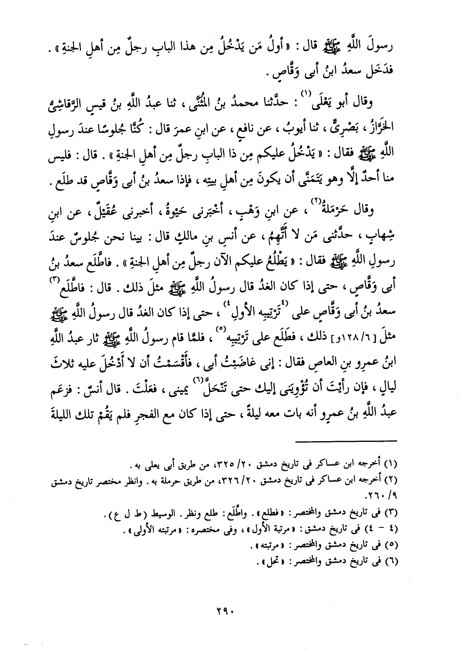 رَسُولَ اللَّهِ صَلَّى اللَّهُ عَلَيْهِ وَسَلَّمَ قَالَ: «أَوَّلُ مَنْ يَدْخُلُ مِنْ هَذَا الْبَابِ رَجُلٌ مِنْ أَهْلِ الْجَنَّةِ ".» فَدَخْلَ سَعْدُ بْنُ أَبِي وَقَّاصٍ.