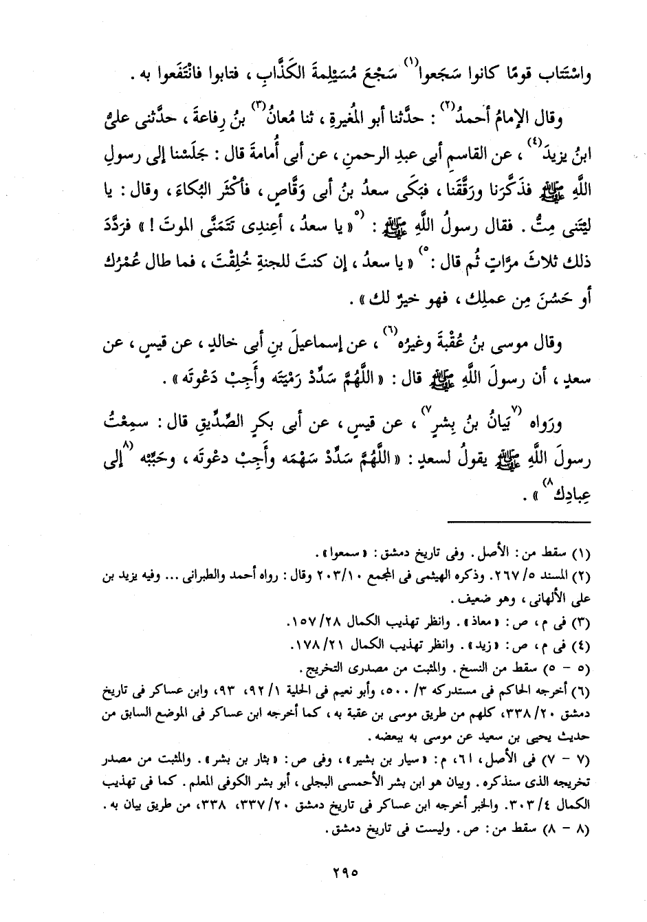 وَقَالَ مُوسَى بْنُ عُقْبَةَ وَغَيْرُهُ، عَنْ إِسْمَاعِيلَ بْنِ أَبِي خَالِدٍ، عَنْ قَيْسٍ، عَنْ سَعْدٍ، أَنَّ رَسُولَ اللَّهِ صَلَّى اللَّهُ عَلَيْهِ وَسَلَّمَ قَالَ: «اللَّهُمَّ سَدِّدْ رَمْيَتَهُ وَأَجِبْ دَعْوَتَهُ ".»
