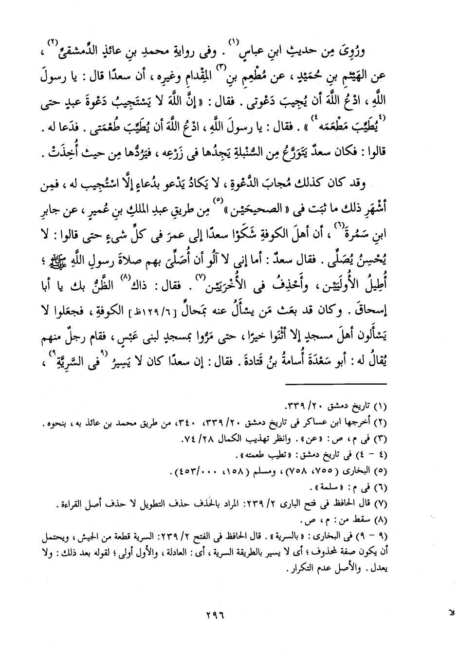 وَرَوَى مِنْ حَدِيثِ ابْنِ عَبَّاسٍ. وَفِي رِوَايَةِ مُحَمَّدِ بْنِ عَائِذٍ الدِّمَشْقِيِّ، عَنِ الْهَيْثَمِ بْنِ حُمَيْدٍ، عَنْ مُطْعِمِ بْنِ الْمِقْدَامِ وَغَيْرِهِ، «أَنَّ سَعْدًا قَالَ: يَا رَسُولَ اللَّهِ، ادْعُ اللَّهَ أَنْ يُجِيبَ دَعْوَتِي. فَقَالَ: " إِنَّ اللَّهَ لَا يَسْتَجِيبُ دَعْوَةَ عَبْدٍ حَتَّى يُطَيِّبَ مَطْعَمَهُ ". فَقَالَ: يَا رَسُولَ اللَّهِ، ادْعُ اللَّهَ أَنْ يُطَيِّبَ طُعْمَتِي. فَدَعَا لَهُ. قَالُوا: فَكَانَ سَعْدٌ يَتَوَرَّعُ مِنَ السُّنْبُلَةِ يَجِدُهَا فِي زَرْعِهِ، فَيَرُدُّهَا مِنْ حَيْثُ أُخِذَتْ» .