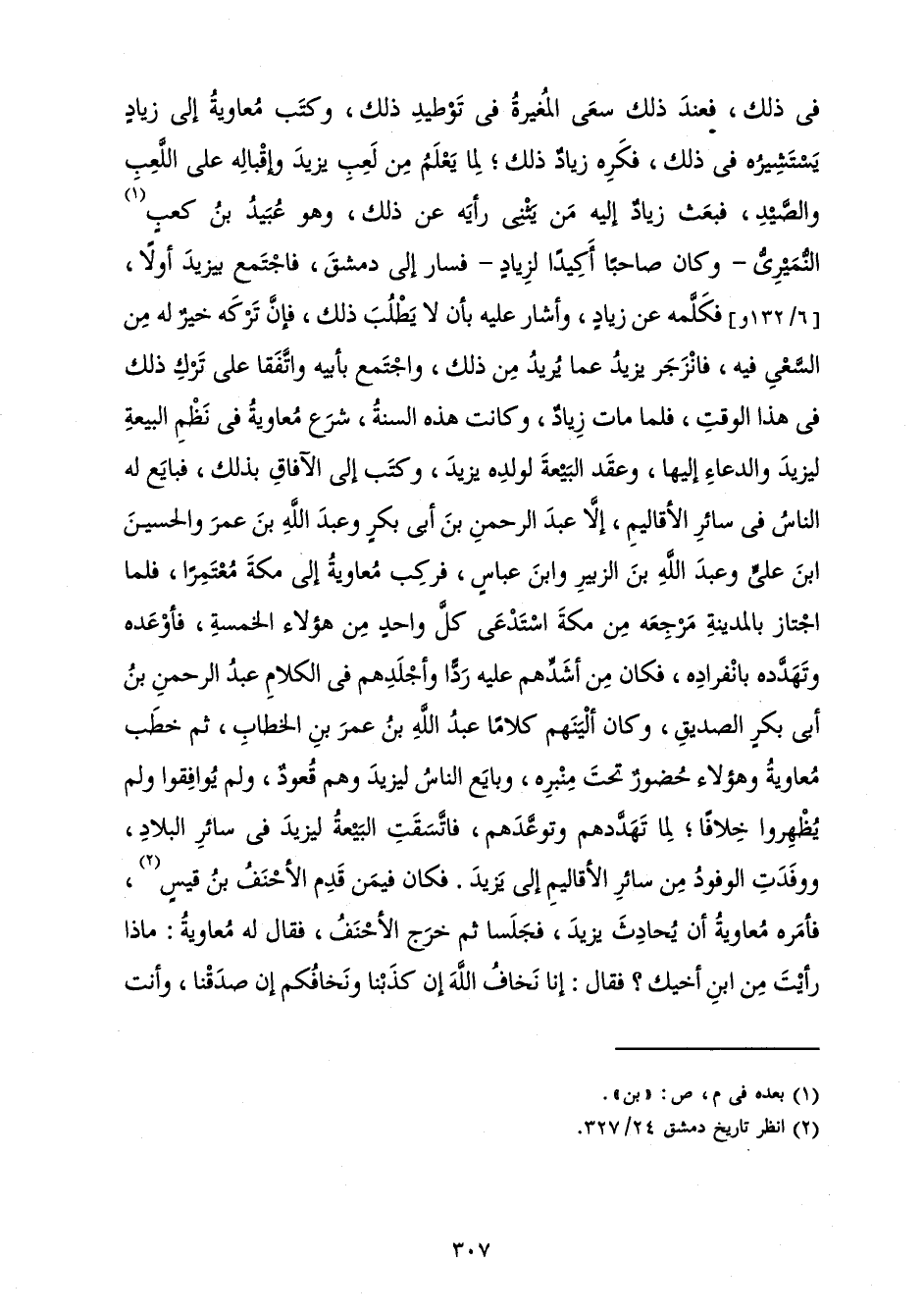 فِي ذَلِكَ، فَعِنْدَ ذَلِكَ سَعَى الْمُغِيرَةُ فِي تَوْطِيدِ ذَلِكَ، وَكَتَبَ مُعَاوِيَةُ إِلَى زِيَادٍ يَسْتَشِيرُهُ فِي ذَلِكَ، فَكَرِهَ زِيَادٌ ذَلِكَ ; لِمَا يَعْلَمُ مِنْ لَعِبِ يَزِيدَ وَإِقْبَالِهِ عَلَى اللَّعِبِ وَالصَّيْدِ، فَبَعَثَ زِيَادٌ إِلَيْهِ مَنْ يَثْنِي رَأْيَهُ عَنْ ذَلِكَ، وَهُوَ عُبَيْدُ بْنُ كَعْبٍ النُّمَيْرِيُّ - وَكَانَ صَاحِبًا أَكِيدًا لِزِيَادٍ - فَسَارَ إِلَى دِمَشْقَ، فَاجْتَمَعَ بِيَزِيدَ أَوَّلًا، فَكَلَّمَهُ عَنْ زِيَادٍ، وَأَشَارَ عَلَيْهِ بِأَنْ لَا يَطْلُبَ ذَلِكَ، فَإِنَّ تَرْكَهُ خَيْرٌ لَهُ مِنَ السَّعْيِ فِيهِ، فَانْزَجَرَ يَزِيدُ عَمَّا يُرِيدُ مِنْ ذَلِكَ، وَاجْتَمَعَ بِأَبِيهِ وَاتَّفَقَا عَلَى تَرْكِ ذَلِكَ فِي هَذَا الْوَقْتِ، فَلَمَّا مَاتَ زِيَادٌ، وَكَانَتْ هَذِهِ السَّنَةُ، شَرَعَ مُعَاوِيَةُ فِي نَظْمِ الْبَيْعَةِ لِيَزِيدَ وَالدُّعَاءِ إِلَيْهَا، وَعَقَدَ الْبَيْعَةَ لِوَلَدِهِ يَزِيدَ، وَكَتَبَ إِلَى الْآفَاقِ بِذَلِكَ، فَبَايَعَ لَهُ النَّاسُ فِي سَائِرِ الْأَقَالِيمِ، إِلَّا عَبْدَ الرَّحْمَنِ بْنَ أَبِي بَكْرٍ وَعَبْدَ اللَّهِ بْنَ عُمَرَ وَالْحُسَيْنَ بْنَ عَلِيٍّ وَعَبْدَ اللَّهِ بْنَ الزُّبَيْرِ وَابْنَ عَبَّاسٍ، فَرَكِبَ مُعَاوِيَةُ إِلَى مَكَّةَ مُعْتَمِرًا، فَلَمَّا اجْتَازَ بِالْمَدِينَةِ مَرْجِعَهُ مِنْ مَكَّةَ اسْتَدْعَى كُلَّ وَاحِدٍ مِنْ هَؤُلَاءِ الْخَمْسَةِ، فَأَوْعَدَهُ وَتَهَدَّدَهُ بِانْفِرَادِهِ، فَكَانَ مِنْ أَشَدِّهِمْ عَلَيْهِ رَدًّا وَأَجْلَدِهِمْ فِي الْكَلَامِ عَبْدُ الرَّحْمَنِ بْنُ أَبِي بَكْرٍ الصِّدِّيقِ، وَكَانَ أَلْيَنَهُمْ كَلَامًا عَبْدُ اللَّهِ بْنُ عُمَرَ بْنِ الْخَطَّابِ، ثُمَّ خَطَبَ مُعَاوِيَةُ وَهَؤُلَاءِ حُضُورٌ تَحْتَ مِنْبَرِهِ، وَبَايَعَ النَّاسُ لِيَزِيدَ وَهُمْ قُعُودٌ، وَلَمْ يُوَافِقُوا وَلَمْ يُظْهِرُوا خِلَافًا ; لِمَا تَهَدَّدَهُمْ وَتَوَعَّدَهُمْ، فَاتَّسَقَتِ الْبَيْعَةُ لِيَزِيدَ فِي سَائِرِ الْبِلَادِ، وَوَفَدَتِ الْوُفُودُ مِنْ سَائِرِ الْأَقَالِيمِ إِلَى يَزِيدَ. فَكَانَ فِيمَنْ قَدِمَ الْأَحْنَفُ بْنُ قَيْسٍ، فَأَمَرَهُ مُعَاوِيَةُ أَنْ يُحَادِثَ يَزِيدَ، فَجَلَسَا ثُمَّ خَرَجَ الْأَحْنَفُ، فَقَالَ لَهُ مُعَاوِيَةُ: مَاذَا رَأَيْتَ مِنِ ابْنِ أَخِيكَ؟ فَقَالَ: إِنَّا نَخَافُ اللَّهَ إِنْ كَذَبْنَا وَنَخَافُكُمْ إِنْ صَدَقْنَا، وَأَنْتَ