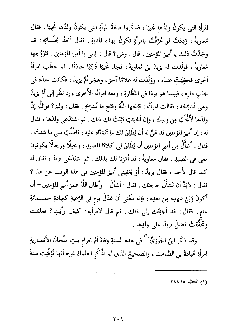 الْمَرْأَةِ الَّتِي يَكُونُ وَلَدُهَا نَجِيبًا، فَذَكَرُوا صِفَةَ الْمَرْأَةِ الَّتِي يَكُونُ وَلَدُهَا نَجِيبًا. فَقَالَ مُعَاوِيَةُ: وَدِدْتُ لَوْ عُرِّفْتُ بِامْرَأَةٍ تَكُونُ بِهَذِهِ الْمَثَابَةِ. فَقَالَ أَحَدُ جُلَسَائِهِ: قَدْ وَجَدْتُ ذَلِكَ يَا أَمِيرَ الْمُؤْمِنِينَ. قَالَ: وَمَنْ؟ قَالَ: ابْنَتِي يَا أَمِيرَ الْمُؤْمِنِينَ. فَتَزَوَّجَهَا مُعَاوِيَةُ، فَوَلَدَتْ لَهُ يَزِيدَ بْنَ مُعَاوِيَةَ، فَجَاءَ نَجِيبًا ذَكِيًّا حَاذِقًا. ثُمَّ خَطَبَ امْرَأَةً أُخْرَى فَحَظِيَتْ عِنْدَهُ، وَوَلَدَتْ لَهُ غُلَامًا آخَرَ، وَهَجَرَ أُمَّ يَزِيدَ، فَكَانَتْ عِنْدَهُ فِي جَنْبِ دَارِهِ، فَبَيْنَمَا هُوَ يَوْمًا فِي النَّظَّارَةِ، وَمَعَهُ امْرَأَتُهُ الْأُخْرَى، إِذْ نَظَرَ إِلَى أُمِّ يَزِيدَ وَهِيَ تُسَرِّحُهُ، فَقَالَتِ امْرَأَتُهُ: قَبَّحَهَا اللَّهُ وَقَبَّحَ مَا تُسَرِّحُ. فَقَالَ: وَلِمَ؟ فَوَاللَّهِ إِنَّ وَلَدَهَا لَأَنْجَبُ مِنْ وَلَدِكِ، وَإِنْ أَحْبَبْتِ بَيَّنْتُ لَكِ ذَلِكَ. ثُمَّ اسْتَدْعَى وَلَدَهَا، فَقَالَ لَهُ: إِنَّ أَمِيرَ الْمُؤْمِنِينَ قَدْ عَنَّ لَهُ أَنْ يُطْلِقَ لَكَ مَا تَتَمَنَّاهُ عَلَيْهِ، فَاطْلُبْ مِنِّي مَا شِئْتَ. فَقَالَ: أَسْأَلُ مِنْ أَمِيرِ الْمُؤْمِنِينَ أَنْ يُطْلِقَ لِي كِلَابًا لِلصَّيْدِ، وَخَيْلًا وَرِجَالًا يَكُونُونَ مَعِي فِي الصَّيْدِ. فَقَالَ مُعَاوِيَةُ: قَدْ أَمَرْنَا لَكَ بِذَلِكَ. ثُمَّ اسْتَدْعَى يَزِيدَ، فَقَالَ لَهُ كَمَا قَالَ لِأَخِيهِ، فَقَالَ يَزِيدُ: أَوَيُعْفِينِي أَمِيرُ الْمُؤْمِنِينَ فِي هَذَا الْوَقْتِ عَنْ هَذَا؟ فَقَالَ: لَا بُدَّ أَنْ تَسْأَلَ حَاجَتَكَ. فَقَالَ: أَسْأَلُ - وَأَطَالَ اللَّهُ عُمُرَ أَمِيرِ الْمُؤْمِنِينَ - أَنْ أَكُونَ وَلِيَّ عَهْدِهِ مِنْ بَعْدِهِ، فَإِنَّهُ بَلَغَنِي أَنَّ عَدْلَ يَوْمٍ فِي الرَّعِيَّةِ كَعِبَادَةِ خَمْسِمِائَةِ عَامٍ. فَقَالَ: قَدْ أَجَبْتُكَ إِلَى ذَلِكَ. ثُمَّ قَالَ لِامْرَأَتِهِ: كَيْفَ رَأَيْتِ؟ فَعَلِمَتْ وَتَحَقَّقَتْ فَضْلَ يَزِيدَ عَلَى وَلَدِهَا.