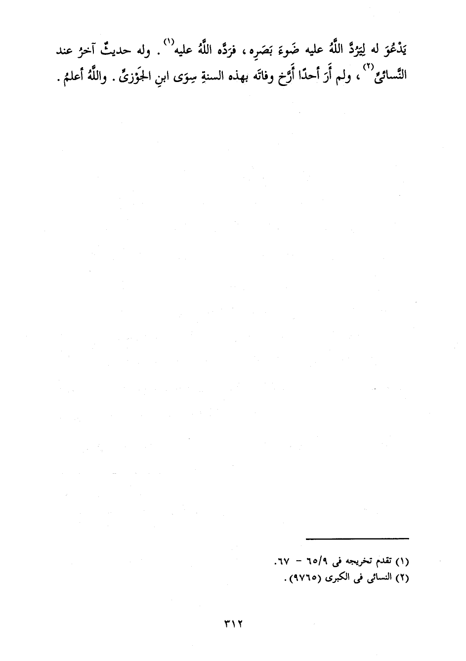 يَدْعُوَ لَهُ لِيَرُدَّ اللَّهُ عَلَيْهِ ضَوْءَ بَصَرِهِ، فَرَدَّهُ اللَّهُ عَلَيْهِ. وَلَهُ حَدِيثٌ آخَرُ عِنْدَ النَّسَائِيِّ، وَلَمْ أَرَ أَحَدًا أَرَّخَ وَفَاتَهُ بِهَذِهِ السَّنَةِ سِوَى ابْنِ الْجَوْزِيِّ. وَاللَّهُ أَعْلَمُ.