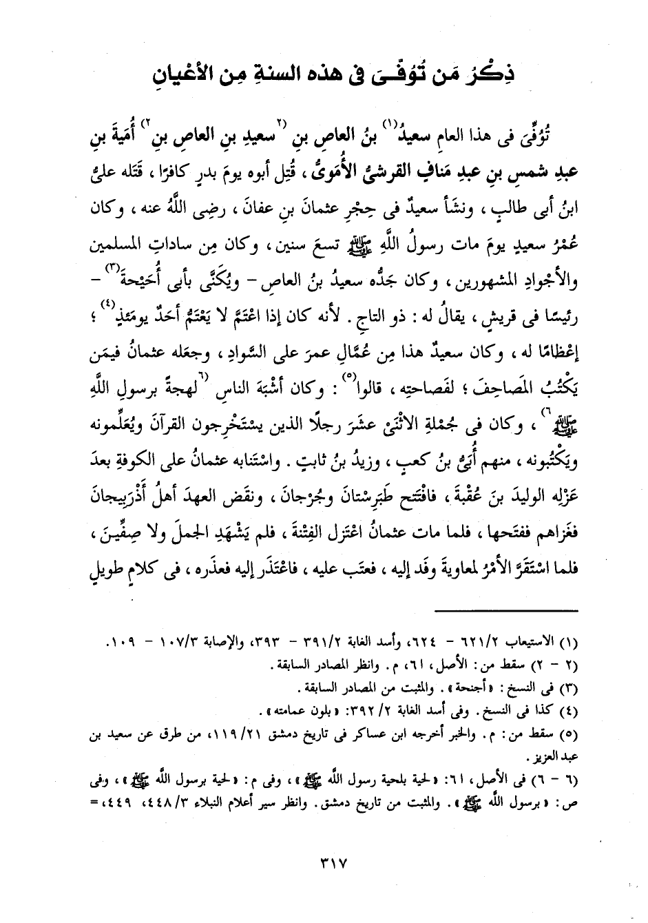 تُوُفِّيَ فِي هَذَا الْعَامِ سَعِيدُ بْنُ الْعَاصِ بْنِ سَعِيدِ بْنِ الْعَاصِ بْنِ أُمَيَّةَ بْنِ عَبْدِ شَمْسِ بْنِ عَبْدِ مُنَافٍ الْقُرَشِيُّ الْأُمَوِيُّ، قُتِلَ أَبُوهُ يَوْمَ بَدْرٍ كَافِرًا، قَتَلَهُ عَلِيُّ بْنُ أَبِي طَالِبٍ وَنَشَأَ سَعِيدٌ فِي حِجْرِ عُثْمَانَ بْنِ عَفَّانَ رَضِيَ اللَّهُ عَنْهُ، وَكَانَ عُمْرُ سَعِيدٍ يَوْمَ مَاتَ رَسُولُ اللَّهِ صَلَّى اللَّهُ عَلَيْهِ وَسَلَّمَ تِسْعَ سِنِينَ، وَكَانَ مِنْ سَادَاتِ الْمُسْلِمِينَ وَالْأَجْوَادِ الْمَشْهُورِينَ، وَكَانَ جَدُّهُ سَعِيدُ بْنُ الْعَاصِ - وَيُكَنَّى بِأَبِي أُحَيْحَةَ - رَئِيسًا فِي قُرَيْشٍ، يُقَالُ لَهُ: ذُو التَّاجِ. لِأَنَّهُ كَانَ إِذَا اعْتَمَّ لَا يَعْتَمُّ أَحَدٌ يَوْمَئِذٍ ; إِعْظَامًا لَهُ، وَكَانَ سَعِيدٌ هَذَا مِنْ عُمَّالِ عُمَرَ عَلَى السَّوَادِ وَجَعَلَهُ عُثْمَانُ فِيمَنْ يَكْتُبُ الْمَصَاحِفَ ; لِفَصَاحَتِهِ، قَالُوا: وَكَانَ أَشْبَهُ النَّاسِ لَهْجَةً بِرَسُولِ اللَّهِ صَلَّى اللَّهُ عَلَيْهِ وَسَلَّمَ، وَكَانَ فِي جُمْلَةِ الِاثْنَيْ عَشَرَ رَجُلًا الَّذِينَ يَسْتَخْرِجُونَ الْقُرْآنَ وَيُعَلِّمُونَهُ وَيَكْتُبُونَهُ، مِنْهُمْ أُبَيُّ بْنُ كَعْبٍ وَزَيْدُ بْنُ ثَابِتٍ. وَاسْتَنَابَهُ عُثْمَانُ عَلَى الْكُوفَةِ بَعْدَ عَزْلِهِ الْوَلِيدَ بْنَ عُقْبَةَ، فَافْتَتَحَ طَبَرِسْتَانَ وَجُرْجَانَ، وَنَقَضَ الْعَهْدَ أَهْلُ أَذْرَبِيجَانَ فَغَزَاهُمْ فَفَتَحَهَا، فَلَمَّا مَاتَ عُثْمَانُ اعْتَزَلَ الْفِتْنَةَ، فَلَمْ يَشْهَدِ الْجَمَلَ وَلَا صِفِّينَ، فَلَمَّا اسْتَقَرَّ الْأَمْرُ لِمُعَاوِيَةَ وَفَدَ إِلَيْهِ، فَعَتَبَ عَلَيْهِ، فَاعْتَذَرَ إِلَيْهِ فَعَذَرَهُ، فِي كَلَامٍ طَوِيلٍ