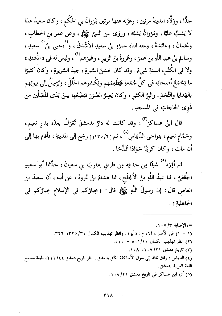 جِدًّا، وَوَلَّاهُ الْمَدِينَةَ مَرَّتَيْنِ، وَعَزَلَهُ عَنْهَا مَرَّتَيْنِ بِمَرْوَانَ بْنِ الْحَكَمِ، وَكَانَ سَعِيدٌ هَذَا لَا يَسُبُّ عَلِيًّا، وَمَرْوَانُ يَسُبُّهُ، وَرَوَى عَنِ النَّبِيِّ صَلَّى اللَّهُ عَلَيْهِ وَسَلَّمَ، وَعَنْ عُمَرَ بْنِ الْخَطَّابِ، وَعُثْمَانَ، وَعَائِشَةَ، وَعَنْهُ ابْنَاهُ عَمْرُو بْنُ سَعِيدٍ الْأَشْدَقُ، وَيَحْيَى بْنُ سَعِيدٍ، وَسَالِمُ بْنُ عَبْدِ اللَّهِ بْنِ عُمَرَ، وَعُرْوَةُ بْنُ الزُّبَيْرِ، وَغَيْرُهُمْ، وَلَيْسَ لَهُ فِي " الْمُسْنَدِ " وَلَا فِي الْكُتُبِ السِّتَّةِ شَيْءٌ. وَقَدْ كَانَ حَسَنَ السِّيرَةِ، جَيِّدَ السَّرِيرَةِ، وَكَانَ كَثِيرًا مَا يَجْمَعُ أَصْحَابَهُ فِي كُلِّ جُمُعَةٍ فَيُطْعِمُهُمْ وَيَكْسُوهُمُ الْحُلَلَ، وَيُرْسِلُ إِلَى بُيُوتِهِمْ بِالْهَدَايَا وَالتُّحَفِ وَالْبِرِّ الْكَثِيرِ، وَكَانَ يُصِرُّ الصُّرَرَ فَيَضَعُهَا بَيْنَ يَدَيِ الْمُصَلِّينَ مِنْ ذَوِي الْحَاجَاتِ فِي الْمَسْجِدِ.