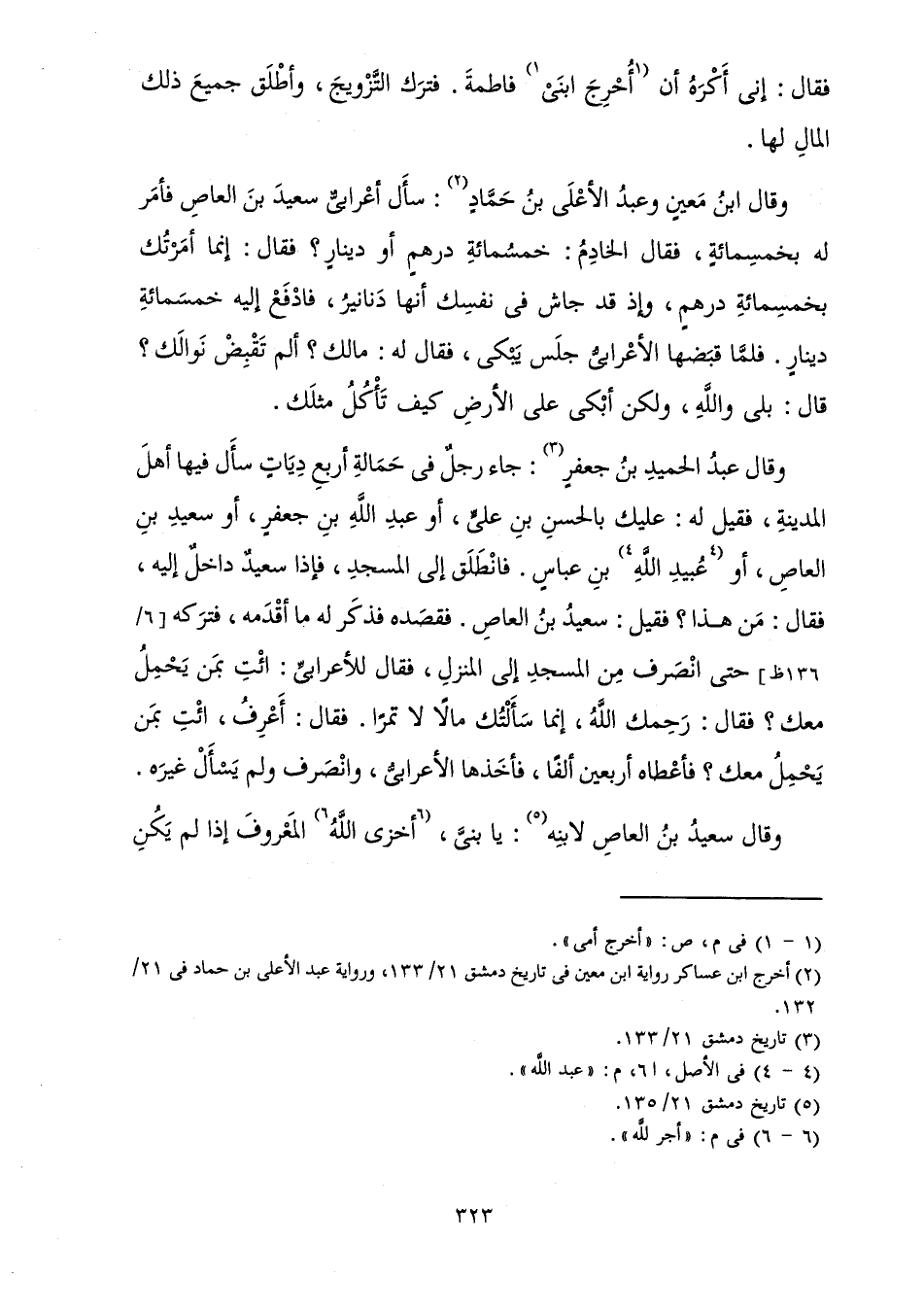 وَقَالَ ابْنُ مَعِينٍ وَعَبْدُ الْأَعَلَى بْنُ حَمَّادٍ: سَأَلَ أَعْرَابِيٌّ سَعِيدَ بْنَ الْعَاصِ فَأَمَرَ لَهُ بِخَمْسِمِائَةٍ، فَقَالَ الْخَادِمُ: خَمْسُمِائَةِ دِرْهَمٍ أَوْ دِينَارٍ؟ فَقَالَ: إِنَّمَا أَمَرْتُكَ بِخَمْسِمِائَةِ دِرْهَمٍ، وَإِذْ قَدْ جَاشَ فِي نَفْسِكَ أَنَّهَا دَنَانِيرُ، فَادْفَعْ إِلَيْهِ خَمْسَمِائَةِ دِينَارٍ. فَلَمَّا قَبَضَهَا الْأَعْرَابِيُّ جَلَسَ يَبْكِي، فَقَالَ لَهُ: مَالِكٌ؟ أَلَمْ تَقْبِضْ نَوَالَكَ؟ قَالَ: بَلَى وَاللَّهِ، وَلَكِنْ أَبْكِي عَلَى الْأَرْضِ كَيْفَ تَأْكُلُ مِثْلَكَ.
