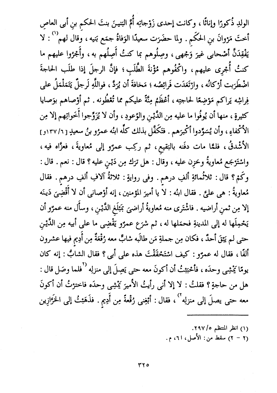 الْوَلَدِ ذُكُورًا وَإِنَاثًا، وَكَانَتْ إِحْدَى زَوْجَاتِهِ أُمَّ الْبَنِينَ بِنْتَ الْحَكَمِ بْنِ أَبِي الْعَاصِ أُخْتَ مَرْوَانَ بْنِ الْحَكَمِ. وَلَمَّا حَضَرَتْ سَعِيدًا الْوَفَاةُ جَمَعَ بَنِيهِ، وَقَالَ لَهُمْ: لَا يَفْقِدْنَ أَصْحَابِي غَيْرَ وَجْهِي، وَصِلُوهُمْ بِمَا كُنْتُ أَصِلُهُمْ بِهِ، وَأَجْرُوا عَلَيْهِمْ مَا كُنْتُ أُجْرِي عَلَيْهِمْ، وَاكْفُوهُمْ مُؤْنَةَ الطَّلَبِ ; فَإِنَّ الرَّجُلَ إِذَا طَلَبَ الْحَاجَةَ اضْطَرَبَتْ أَرْكَانُهُ، وَارْتَعَدَتْ فَرَائِصُهُ ; مَخَافَةَ أَنْ يُرَدَّ، فَوَاللَّهِ لَرَجُلٌ يَتَمَلْمَلُ عَلَى فِرَاشِهِ يَرَاكُمْ مَوْضِعًا لِحَاجَتِهِ، أَعْظَمُ مِنَّةً عَلَيْكُمْ مِمَّا تُعْطُونَهُ. ثُمَّ أَوْصَاهُمْ بِوَصَايَا كَثِيرَةٍ، مِنْهَا أَنْ يُوَفُّوا مَا عَلَيْهِ مِنَ الدَّيْنِ وَالْوُعُودِ، وَأَنْ لَا يُزَوِّجُوا أَخَوَاتِهِمْ إِلَّا مِنَ الْأَكْفَاءِ، وَأَنْ يُسَوِّدُوا أَكْبَرَهُمْ. فَتَكَفَّلَ بِذَلِكَ كُلِّهِ ابْنُهُ عَمْرُو بْنُ سَعِيدٍ الْأَشْدَقُ، فَلَمَّا مَاتَ دَفَنَهُ بِالْبَقِيعِ، ثُمَّ رَكِبَ عَمْرٌو إِلَى مُعَاوِيَةَ، فَعَزَّاهُ فِيهِ، وَاسْتَرْجَعَ مُعَاوِيَةُ وَحَزِنَ عَلَيْهِ، وَقَالَ: هَلْ تَرَكَ مِنْ دَيْنٍ عَلَيْهِ؟ قَالَ: نَعَمْ. قَالَ: وَكَمْ؟ قَالَ: ثَلَاثُمِائَةِ أَلْفِ دِرْهَمٍ. وَفِي رِوَايَةٍ: ثَلَاثُ آلَافِ أَلْفِ دِرْهَمٍ. فَقَالَ مُعَاوِيَةُ: هِيَ عَلَيَّ. فَقَالَ ابْنُهُ: لَا يَا أَمِيرَ الْمُؤْمِنِينَ، إِنَّهُ أَوْصَانِي أَنْ لَا أَقْضِيَ دَيْنَهُ إِلَّا مِنْ ثَمَنِ أَرَاضِيهِ. فَاشْتَرَى مِنْهُ مُعَاوِيَةُ أَرَاضِيَ بِمَبْلَغِ الدَّيْنِ، وَسَأَلَ مِنْهُ عَمْرٌو أَنْ يَحْمِلَهَا لَهُ إِلَى الْمَدِينَةِ فَحَمَلَهَا لَهُ، ثُمَّ شَرَعَ عَمْرٌو يَقْضِي مَا عَلَى أَبِيهِ مِنَ الدَّيْنِ حَتَّى لَمْ يَبْقَ أَحَدٌ، فَكَانَ مِنْ جُمْلَةِ مَنْ طَالَبَهُ شَابٌّ مَعَهُ رُقْعَةٌ مِنْ أَدِيمٍ فِيهَا عِشْرُونَ أَلْفًا، فَقَالَ لَهُ عَمْرٌو: كَيْفَ اسْتَحْقَقْتَ هَذِهِ عَلَى أَبِي؟ فَقَالَ الشَّابُّ: إِنَّهُ كَانَ يَوْمًا يَمْشِي وَحْدَهُ، فَأَحْبَبْتُ أَنْ أَكُونَ مَعَهُ حَتَّى يَصِلَ إِلَى مَنْزِلِهِ فَلَمَّا وَصَلَ قَالَ: هَلْ مِنْ حَاجَةٍ؟ فَقُلْتُ: لَا إِلَّا أَنِّي رَأَيْتُ الْأَمِيرَ يَمْشِي وَحْدَهُ فَاخْتَرْتُ أَنْ أَكُونَ مَعَهُ حَتَّى يَصِلَ إِلَى مَنْزِلِهِ، فَقَالَ: أَبْغِنِي رُقْعَةً مِنْ أَدِيمٍ. فَذَهَبْتُ إِلَى الْخَرَّازِينَ