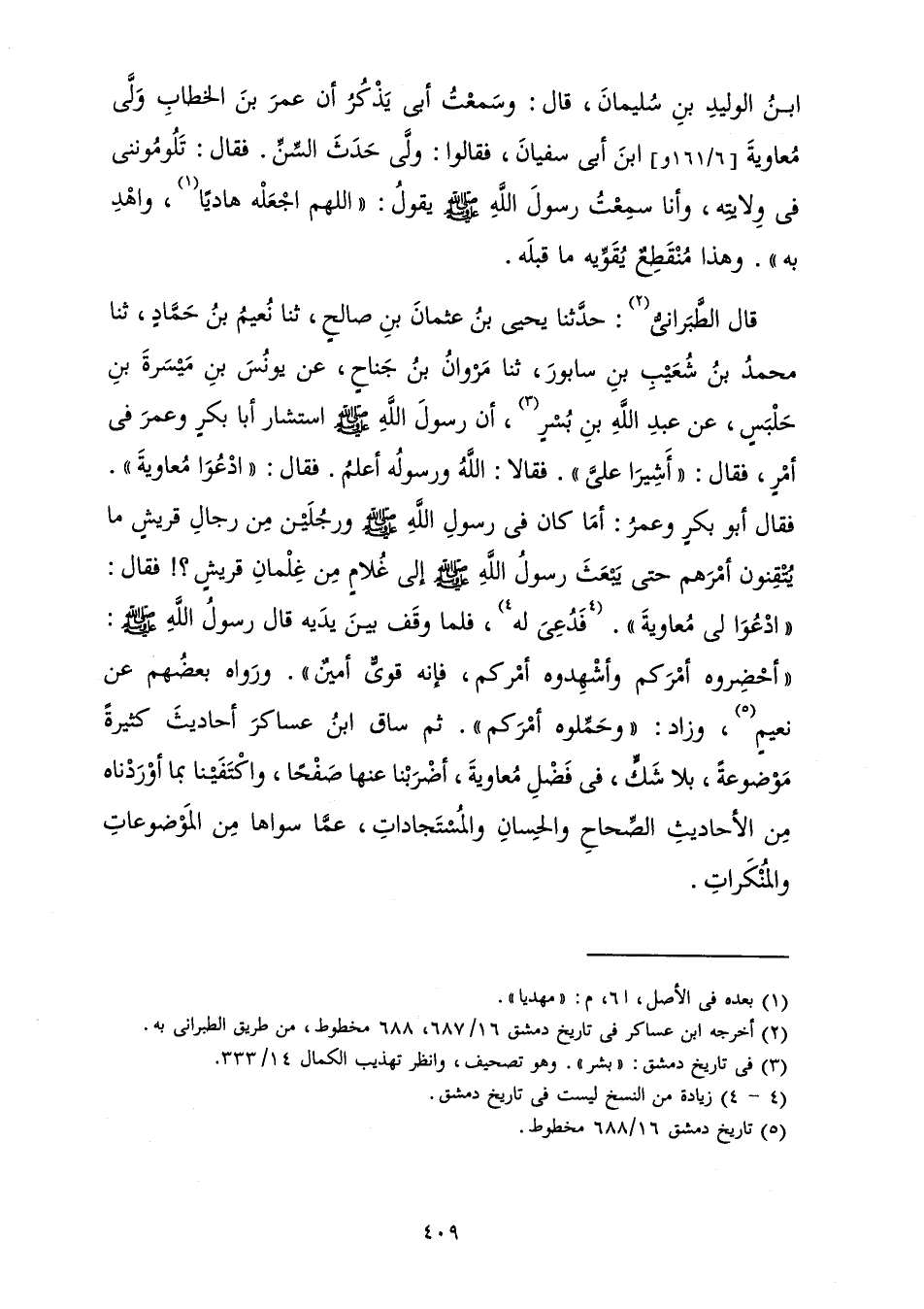 بْنُ الْوَلِيدِ بْنِ سُلَيْمَانَ، قَالَ: وَسَمِعْتُ أَبِي يَذْكُرُ أَنَّ عُمَرَ بْنَ الْخَطَّابِ وَلَّى مُعَاوِيَةَ بْنَ أَبِي سُفْيَانَ، فَقَالُوا: وَلَّى حَدَثَ السِّنِّ. فَقَالَ: تَلُومُونَنِي فِي وِلَايَتِهِ، وَأَنَا سَمِعْتُ رَسُولَ اللَّهِ صَلَّى اللَّهُ عَلَيْهِ وَسَلَّمَ يَقُولُ: «اللَّهُمَّ اجْعَلْهُ هَادِيًا، وَاهْدِ بِهِ ".» وَهَذَا مُنْقَطِعٌ يُقَوِّيهِ مَا قَبْلَهُ.
