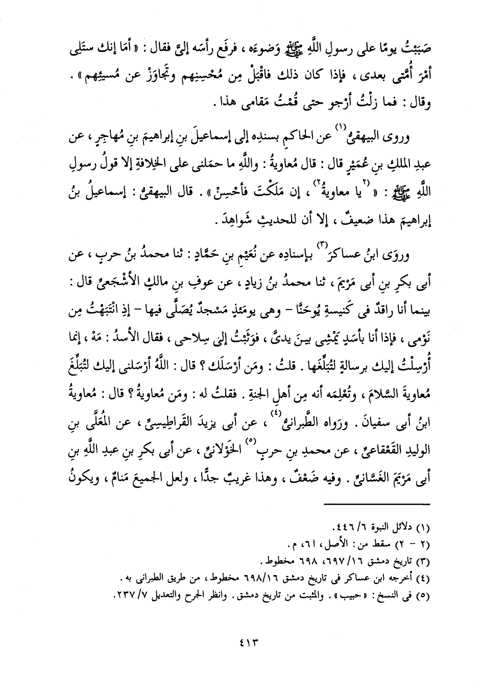 وَرَوَى الْبَيْهَقِيُّ عَنِ الْحَاكِمِ بِسَنَدِهِ إِلَى إِسْمَاعِيلَ بْنِ إِبْرَاهِيمَ بْنِ مُهَاجِرٍ، عَنْ عَبْدِ الْمَلِكِ بْنِ عُمَيْرٍ قَالَ: قَالَ مُعَاوِيَةُ: وَاللَّهِ مَا حَمَلَنِي عَلَى الْخِلَافَةِ إِلَّا قَوْلُ رَسُولِ اللَّهِ صَلَّى اللَّهُ عَلَيْهِ وَسَلَّمَ: «يَا مُعَاوِيَةُ، إِنْ مَلَكْتَ فَأَحْسِنْ ".» قَالَ الْبَيْهَقِيُّ: إِسْمَاعِيلُ بْنُ إِبْرَاهِيمَ هَذَا ضَعِيفٌ، إِلَّا أَنَّ لِلْحَدِيثِ شَوَاهِدَ.