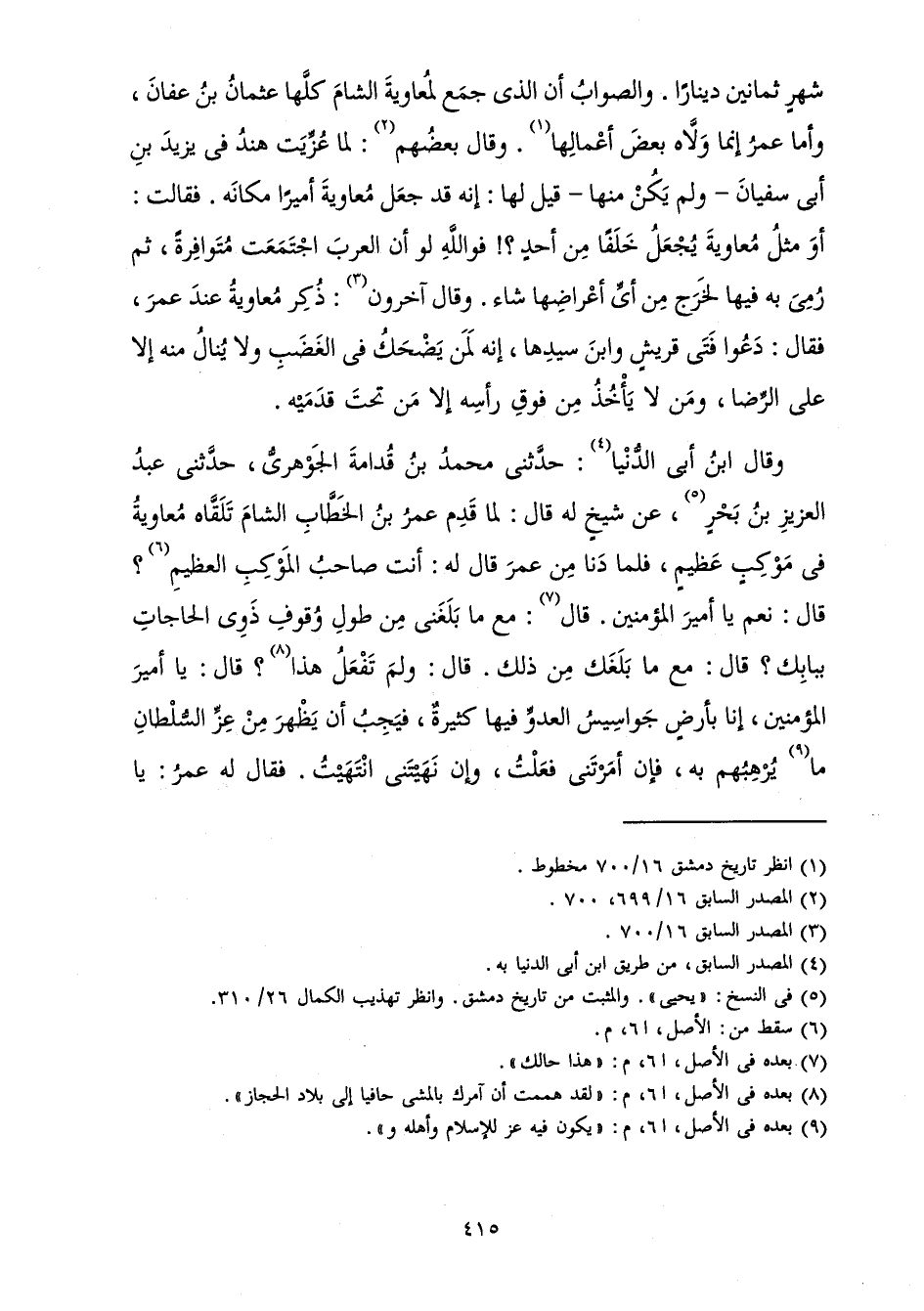 شَهْرٍ ثَمَانِينَ دِينَارًا. وَالصَّوَابُ أَنَّ الَّذِي جَمَعَ لِمُعَاوِيَةَ الشَّامَ كُلَّهَا عُثْمَانُ بْنُ عَفَّانَ وَأَمَّا عُمَرُ إِنَّمَا وَلَّاهُ بَعْضَ أَعْمَالِهَا. وَقَالَ بَعْضُهُمْ: لَمَّا عُزِّيَتْ هِنْدُ فِي يَزِيدَ بْنِ أَبِي سُفْيَانَ - وَلَمْ يَكُنْ مِنْهَا - قِيلَ لَهَا: إِنَّهُ قَدْ جَعَلَ مُعَاوِيَةَ أَمِيرًا مَكَانَهُ. فَقَالَتْ: أَوَ مِثْلُ مُعَاوِيَةَ يُجْعَلُ خَلَفًا مِنْ أَحَدٍ؟ ! فَوَاللَّهِ لَوْ أَنَّ الْعَرَبَ اجْتَمَعَتْ مُتَوَافِرَةً، ثُمَّ رُمِيَ بِهِ فِيهَا لَخَرَجَ مِنْ أَيِّ أَعْرَاضِهَا شَاءَ. وَقَالَ آخَرُونَ: ذُكِرَ مُعَاوِيَةُ عِنْدَ عُمَرَ، فَقَالَ: دَعُوا فَتَى قُرَيْشٍ وَابْنَ سَيِّدِهَا، إِنَّهُ لَمَنْ يَضْحَكُ فِي الْغَضَبِ وَلَا يُنَالُ مِنْهُ إِلَّا عَلَى الرِّضَا، وَمَنْ لَا يَأْخُذُ مِنْ فَوْقِ رَأْسِهِ إِلَّا مِنْ تَحْتِ قَدْمَيْهِ.