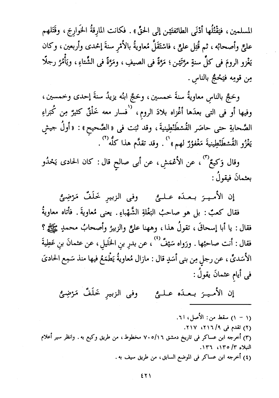 فَقَالَ كَعْبٌ: بَلْ هُوَ صَاحِبُ الْبَغْلَةِ الشَّهْبَاءِ. يَعْنِي مُعَاوِيَةَ. فَأَتَاهُ مُعَاوِيَةُ فَقَالَ: يَا أَبَا إِسْحَاقَ، تَقُولُ هَذَا، وَهَاهُنَا عَلِيٌّ وَالزُّبَيْرُ وَأَصْحَابُ مُحَمَّدٍ صَلَّى اللَّهُ عَلَيْهِ وَسَلَّمَ؟ فَقَالَ: أَنْتَ صَاحِبُهَا. وَرَوَاهُ سَيْفٌ، عَنْ بَدْرِ بْنِ الْخَلِيلِ، عَنْ عُثْمَانَ بْنِ عَطِيَّةَ الْأَسَدِيِّ، عَنْ رَجُلٍ مِنْ بَنِي أَسَدٍ قَالَ: مَا زَالَ مُعَاوِيَةُ يَطْمَعُ فِيهَا مُنْذُ سَمِعَ الْحَادِي فِي أَيَّامِ عُثْمَانَ يَقُولُ: