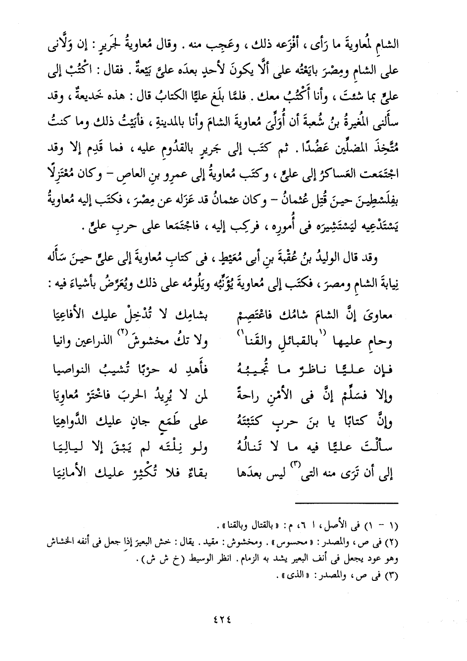 وَقَدْ قَالَ الْوَلِيدُ بْنُ عُقْبَةَ بْنِ أَبِي مُعَيْطٍ، فِي كِتَابِ مُعَاوِيَةَ إِلَى عَلِيٍّ حِينَ سَأَلَهُ نِيَابَةَ الشَّامِ وَمِصْرَ، فَكَتَبَ إِلَى مُعَاوِيَةَ يُؤَنِّبُهُ وَيَلُومُهُ عَلَى ذَلِكَ وَيُعَرِّضُ بِأَشْيَاءَ فِيهِ: