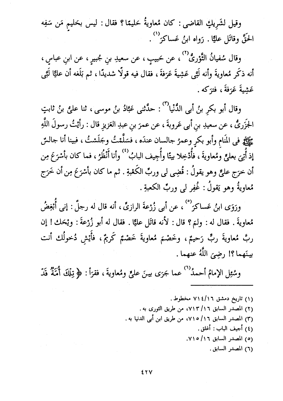 وَقِيلَ لِشَرِيكٍ الْقَاضِي: كَانَ مُعَاوِيَةُ حَلِيمًا؟ فَقَالَ: لَيْسَ بِحَلِيمٍ مَنْ سَفِهَ الْحَقَّ وَقَاتَلَ عَلِيًّا. رَوَاهُ ابْنُ عَسَاكِرَ.