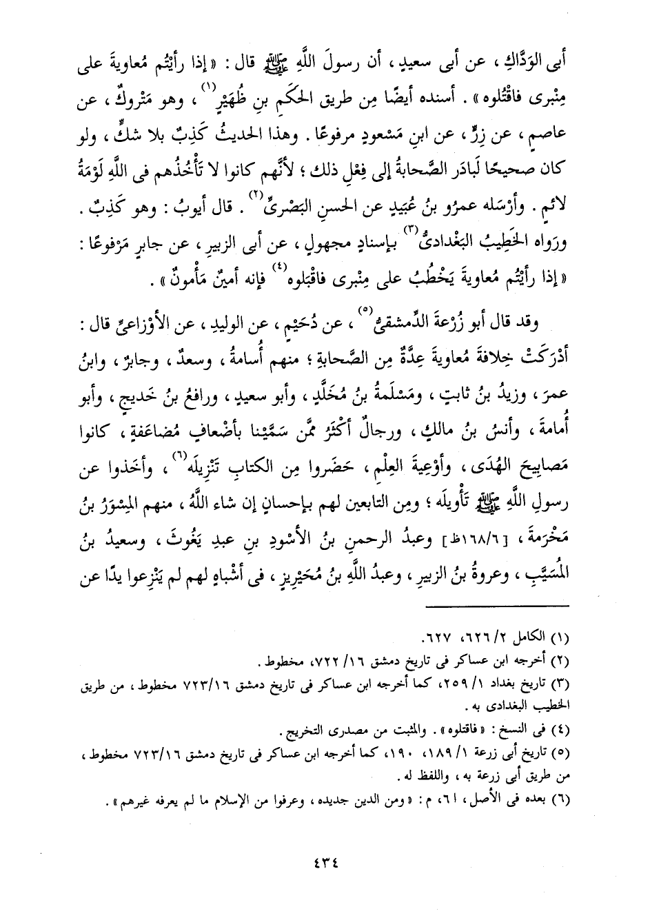أَبِي الْوَدَّاكِ، عَنْ أَبِي سَعِيدٍ، أَنَّ رَسُولَ اللَّهِ صَلَّى اللَّهُ عَلَيْهِ وَسَلَّمَ قَالَ: «إِذَا رَأَيْتُمْ مُعَاوِيَةَ عَلَى مِنْبَرِي فَاقْتُلُوهُ ".» أَسْنَدَهُ أَيْضًا مِنْ طَرِيقِ الْحَكَمِ بْنِ ظُهَيْرٍ، وَهُوَ مَتْرُوكٌ، عَنْ عَاصِمٍ، عَنْ زِرٍّ، عَنِ ابْنِ مَسْعُودٍ مَرْفُوعًا. وَهَذَا الْحَدِيثُ كَذِبٌ بِلَا شَكٍّ، وَلَوْ كَانَ صَحِيحًا لَبَادَرَ الصَّحَابَةُ إِلَى فِعْلِ ذَلِكَ ; لِأَنَّهُمْ كَانُوا لَا تَأْخُذُهُمْ فِي اللَّهِ لَوْمَةَ لَائِمٍ. وَأَرْسَلَهُ عَمْرُو بْنُ عُبَيْدٍ عَنِ الْحَسَنِ الْبَصْرِيِّ. قَالَ أَيُّوبُ: وَهُوَ كَذِبٌ. وَرَوَاهُ الْخَطِيبُ الْبَغْدَادِيُّ بِإِسْنَادٍ مَجْهُولٍ، عَنْ أَبِي الزُّبَيْرِ، عَنْ جَابِرٍ مَرْفُوعًا «إِذَا رَأَيْتُمْ مُعَاوِيَةَ يَخْطُبُ عَلَى مِنْبَرِي فَاقْبَلُوهُ فَإِنَّهُ أَمِينٌ مَأْمُونٌ ".»