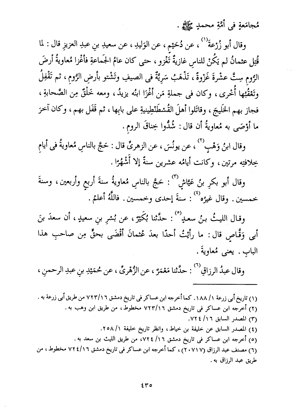 وَقَالَ أَبُو زُرْعَةَ عَنْ دُحَيْمٍ، عَنِ الْوَلِيدِ، عَنْ سَعِيدِ بْنِ عَبْدِ الْعَزِيزِ قَالَ: لَمَّا قُتِلَ عُثْمَانُ لَمْ يَكُنْ لِلنَّاسِ غَازِيَةٌ تَغْزُو، حَتَّى كَانَ عَامُ الْجَمَاعَةِ فَأَغْزَا مُعَاوِيَةُ أَرْضَ الرُّومِ سِتَّ عَشْرَةَ غَزْوَةً، تَذْهَبُ سَرِيَّةٌ فِي الصَّيْفِ وَتَشْتُو بِأَرْضِ الرُّومِ، ثُمَّ تَقْفِلُ وَتَعْقُبُهَا أُخْرَى، وَكَانَ فِي جُمْلَةِ مَنْ أَغَزَا ابْنُهُ يَزِيدُ، وَمَعَهُ خَلْقٌ مِنَ الصَّحَابَةِ، فَجَازَ بِهِمُ الْخَلِيجَ، وَقَاتَلُوا أَهْلَ الْقُسْطَنْطِينِيَّةِ عَلَى بَابِهَا، ثُمَّ قَفَلَ بِهِمْ، وَكَانَ آخِرَ مَا أَوْصَى بِهِ مُعَاوِيَةُ أَنْ قَالَ: شُدُّوا خِنَاقَ الرُّومِ.
