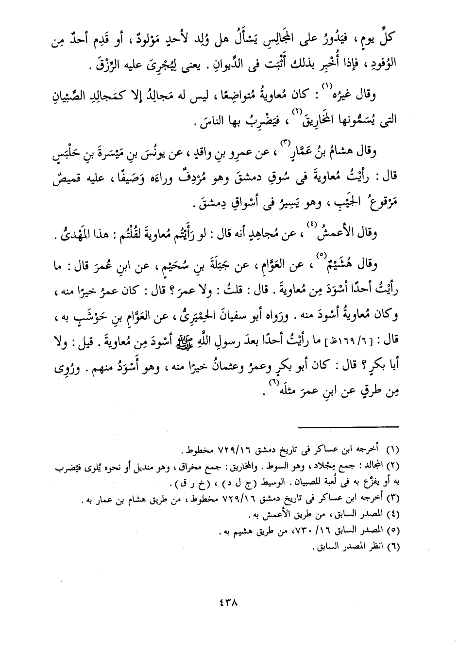 وَقَالَ غَيْرُهُ: كَانَ مُعَاوِيَةُ مُتَوَاضِعًا، لَيْسَ لَهُ مَجَالِدُ إِلَّا كَمَجَالِدِ الصِّبْيَانِ الَّتِي يُسَمُّونَهَا الْمَخَارِيقَ، فَيَضْرِبُ بِهَا النَّاسَ.