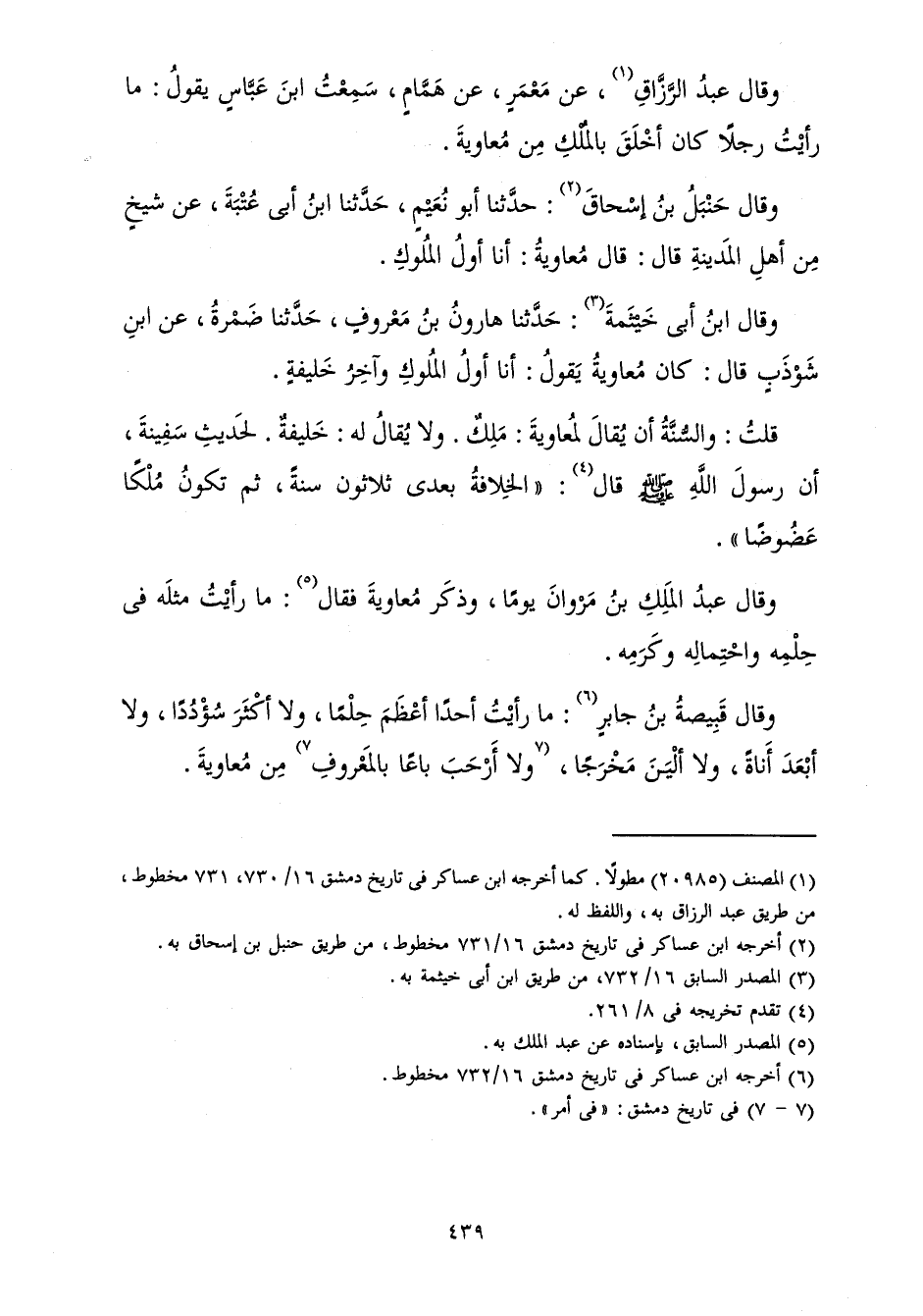 وَقَالَ حَنْبَلُ بْنُ إِسْحَاقَ: حَدَّثَنَا أَبُو نُعَيْمٍ، حَدَّثَنَا ابْنُ أَبِي عُتْبَةَ، عَنْ شَيْخٍ مِنْ أَهْلِ الْمَدِينَةِ قَالَ: قَالَ مُعَاوِيَةُ: أَنَا أَوَّلُ الْمُلُوكِ.