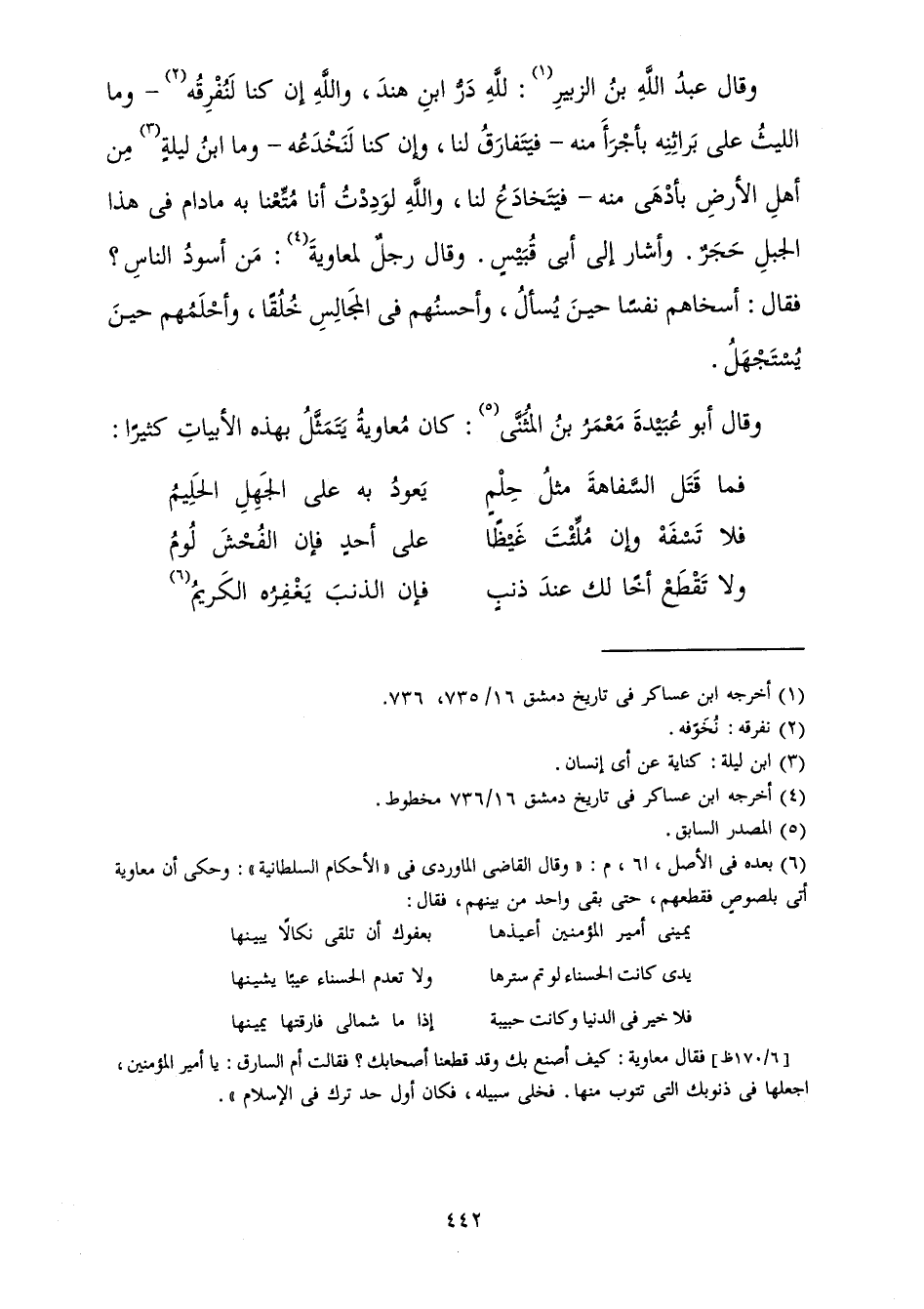 وَقَالَ أَبُو عُبَيْدَةَ مَعْمَرُ بْنُ الْمُثَنَّى: كَانَ مُعَاوِيَةُ يَتَمَثَّلُ بِهَذِهِ الْأَبْيَاتِ كَثِيرًا: