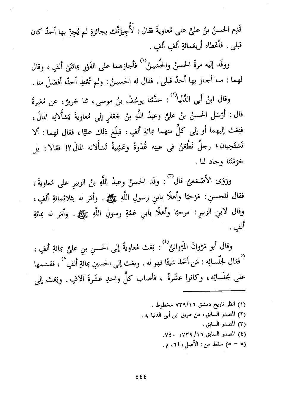 وَقَالَ ابْنُ أَبِي الدُّنْيَا: حَدَّثَنَا يُوسُفُ بْنُ مُوسَى، ثَنَا جَرِيرٌ عَنْ مُغِيرَةَ قَالَ: أَرْسَلَ الْحَسَنُ بْنُ عَلِيٍّ وَعَبْدُ اللَّهِ بْنُ جَعْفَرٍ إِلَى مُعَاوِيَةَ يَسْأَلَانِهِ الْمَالَ، فَبَعَثَ إِلَيْهِمَا أَوْ إِلَى كُلٍّ مِنْهُمَا بِمِائَةِ أَلْفٍ، فَبَلَغَ ذَلِكَ عَلِيًّا، فَقَالَ لَهُمَا: أَلَا تَسْتَحِيَانِ ; رَجُلٌ نَطْعَنُ فِي عَيْنِهِ غُدْوَةً وَعَشِيَّةً تَسْأَلَانِهِ الْمَالَ؟ ! فَقَالَا: بَلْ حَرَمْتَنَا وَجَادَ لَنَا.