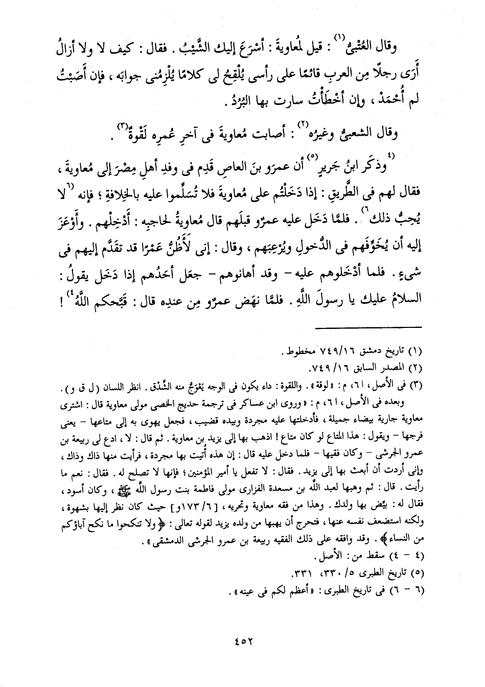 وَذَكَرَ ابْنَ جَرِيرٍ أَنَّ عَمْرَو بْنَ الْعَاصِ قَدِمَ فِي وَفْدِ أَهْلِ مِصْرَ إِلَى مُعَاوِيَةَ، فَقَالَ لَهُمْ فِي الطَّرِيقِ: إِذَا دَخَلْتُمْ عَلَى مُعَاوِيَةَ فَلَا تُسَلِّمُوا عَلَيْهِ بِالْخِلَافَةِ ; فَإِنَّهُ لَا يُحِبُّ ذَلِكَ. فَلَمَّا دَخَلَ عَلَيْهِ عَمْرٌو قَبْلَهُمْ قَالَ مُعَاوِيَةُ لِحَاجِبِهِ: أَدْخِلْهُمْ. وَأَوْعَزَ إِلَيْهِ أَنْ يُخَوِّفَهُمْ فِي الدُّخُولِ وَيُرْعِبَهُمْ، وَقَالَ: إِنِّي لَأَظُنُّ عَمْرًا قَدْ تَقَدَّمَ إِلَيْهِمْ فِي شَيْءٍ. فَلَمَّا أَدْخَلُوهُمْ عَلَيْهِ - وَقَدْ أَهَانُوهُمْ - جَعَلَ أَحَدُهُمْ إِذَا دَخَلَ يَقُولُ: السَّلَامُ عَلَيْكَ يَا رَسُولَ اللَّهِ. فَلَمَّا نَهَضَ عَمْرٌو مِنْ عِنْدِهِ قَالَ: قَبَّحَكُمُ اللَّهُ!